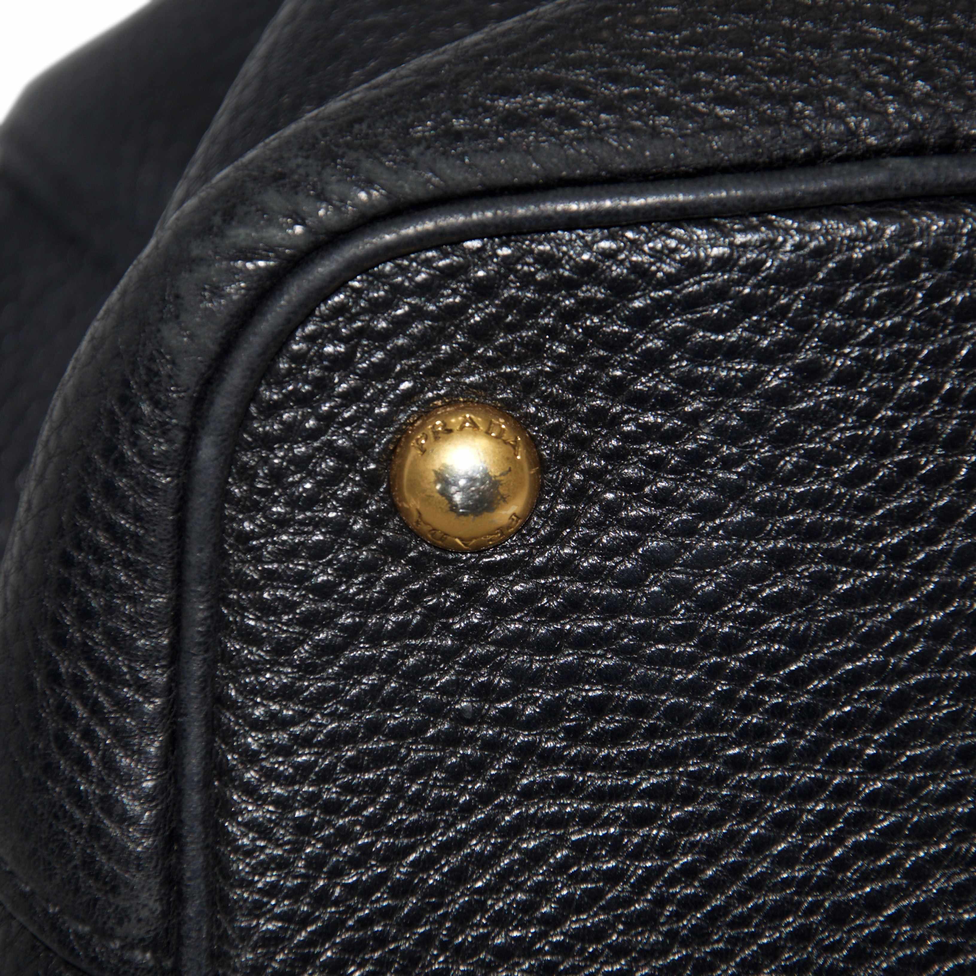 Condition: Fair; some surface scratches and tarnishing at hardware; slight scuffs at exterior edges and base; some residue and ripped interior lining