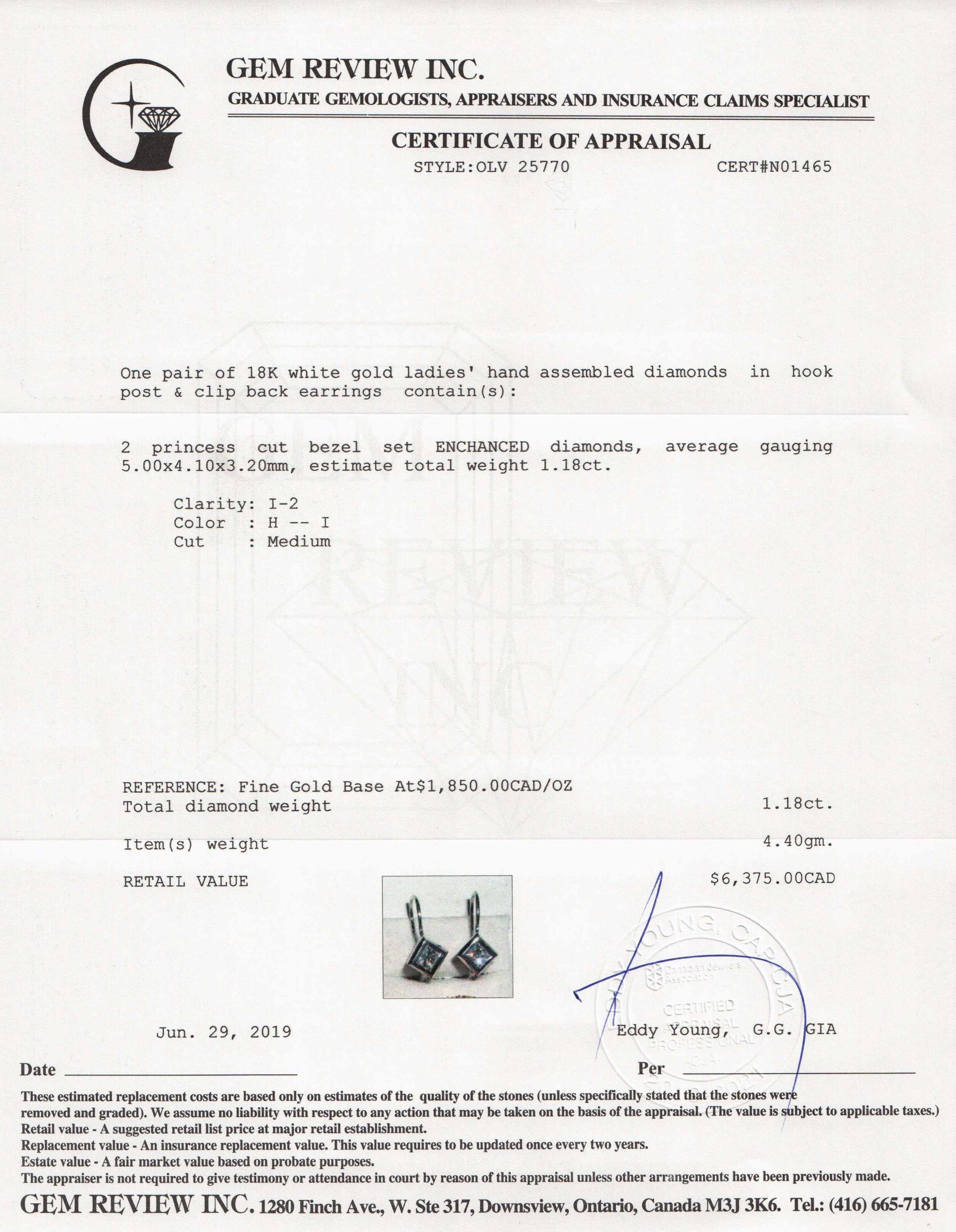 • 2 Princess Cut Bezel-Set Enhanced Diamonds Totalling Approximately 1.18 ct. of I2 Clarity, H-I Colour, Medium Cut