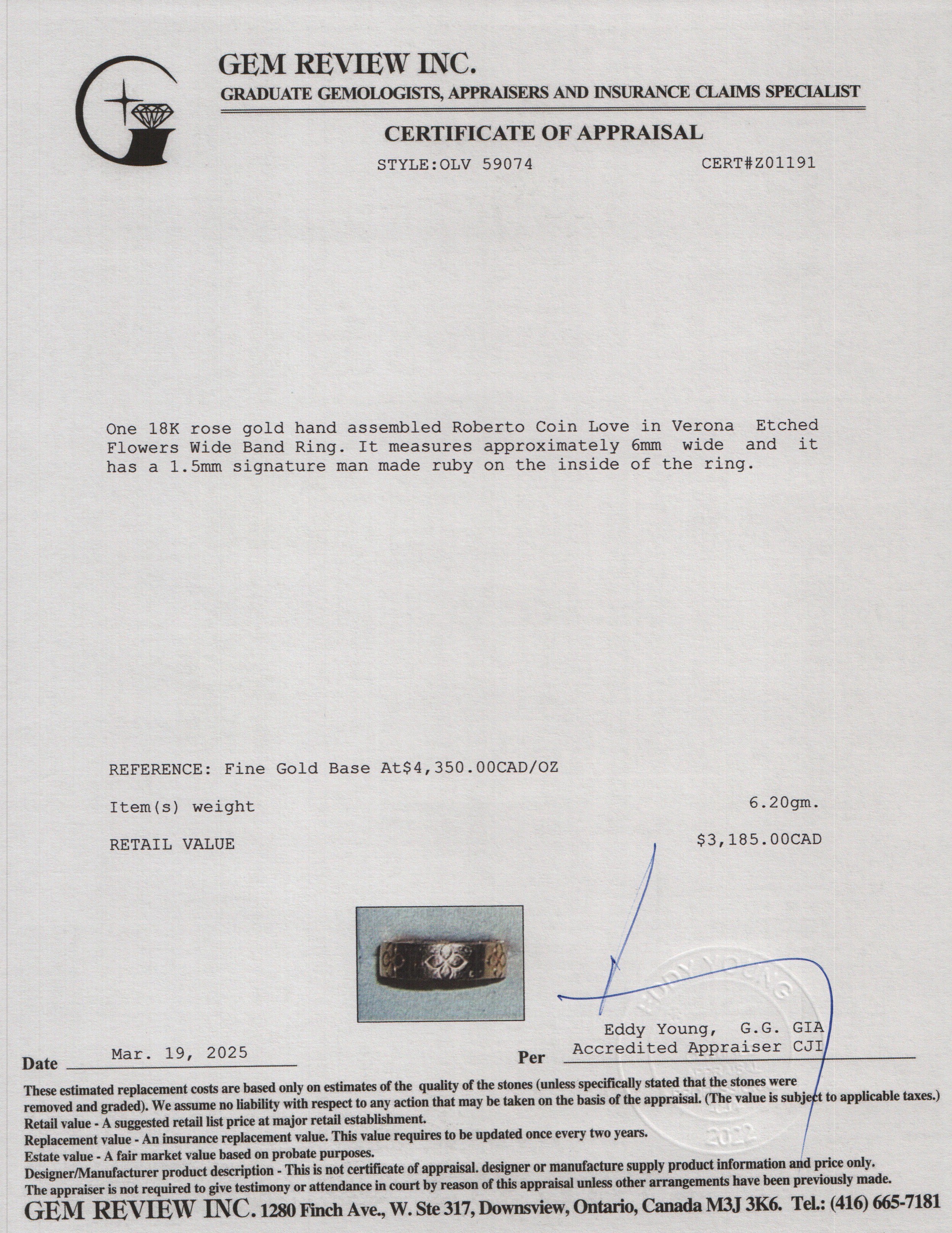 18k Rose Gold Love in Verona Etched Flowers Wide Band Ring, Size 8.5 w/ Box