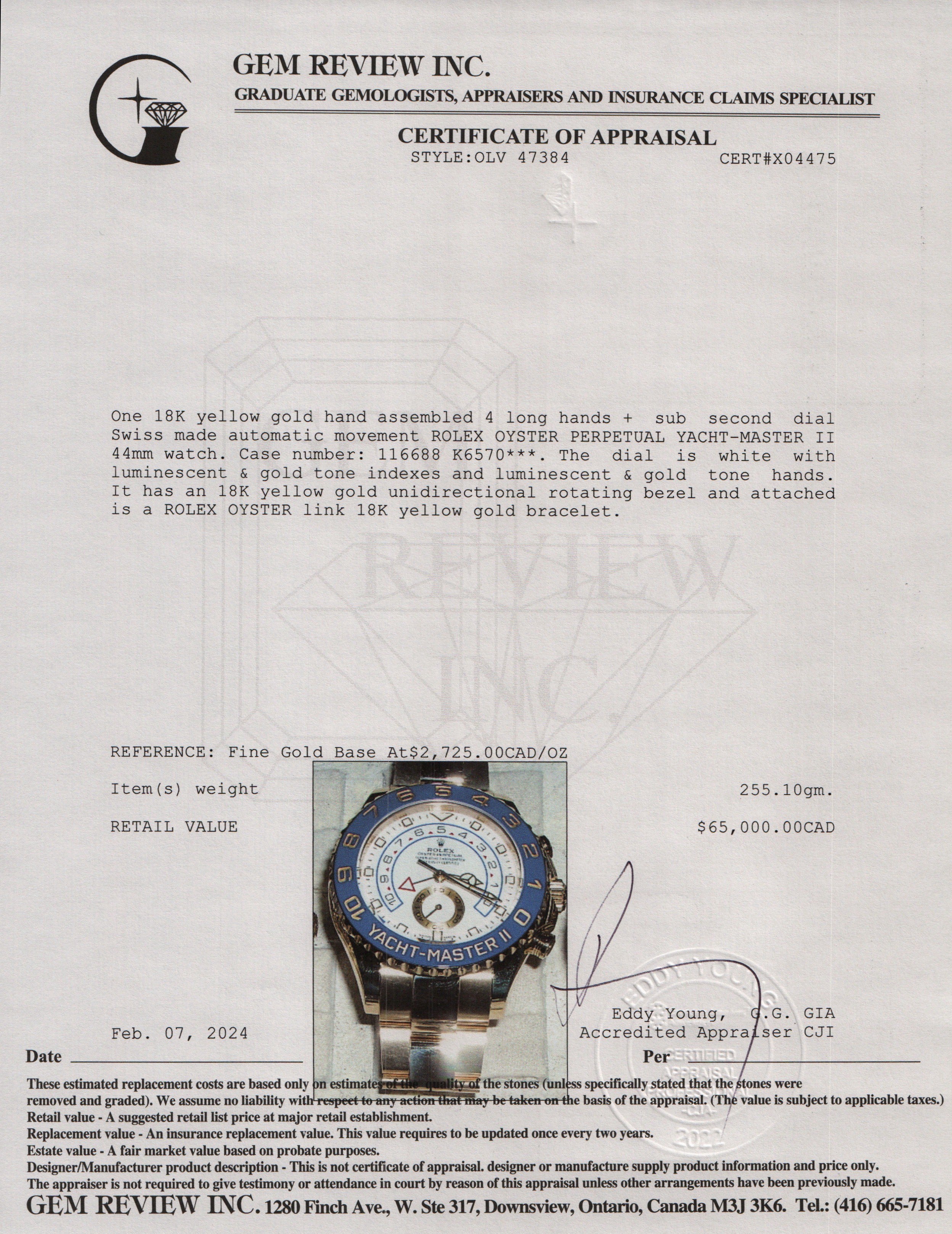 18k Yellow Gold Day Yacht-Master II 44 MM Watch w/ Box & Papers