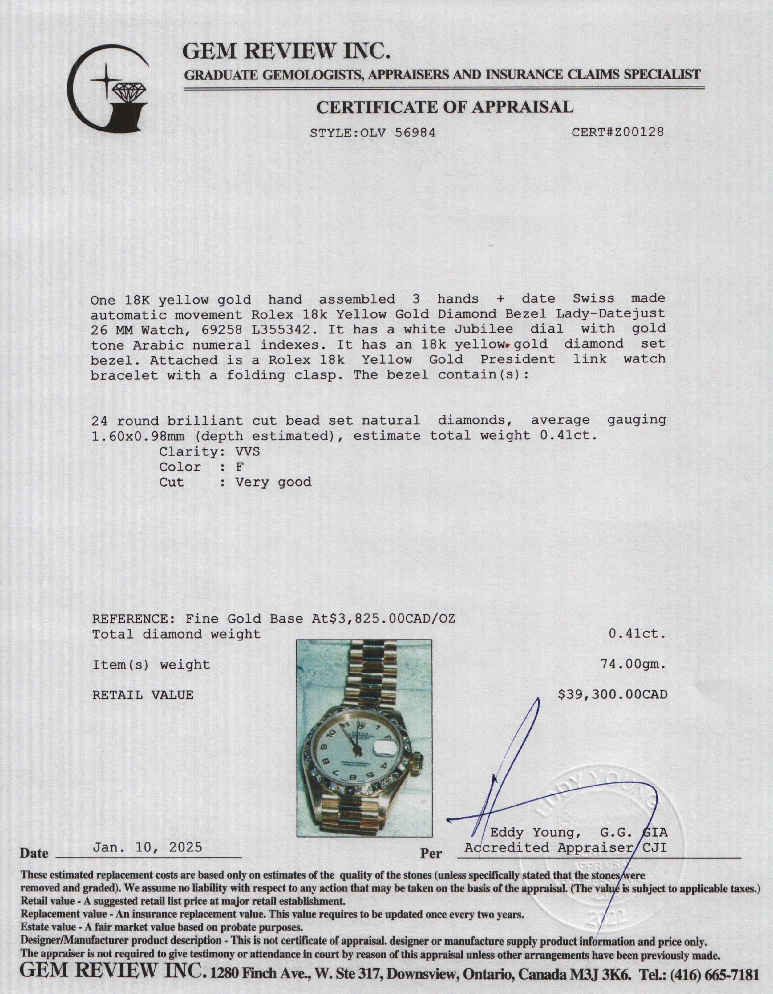 18k Yellow Gold Diamond Bezel Lady-Datejust 26 MM Watch 69258 w/ Box
