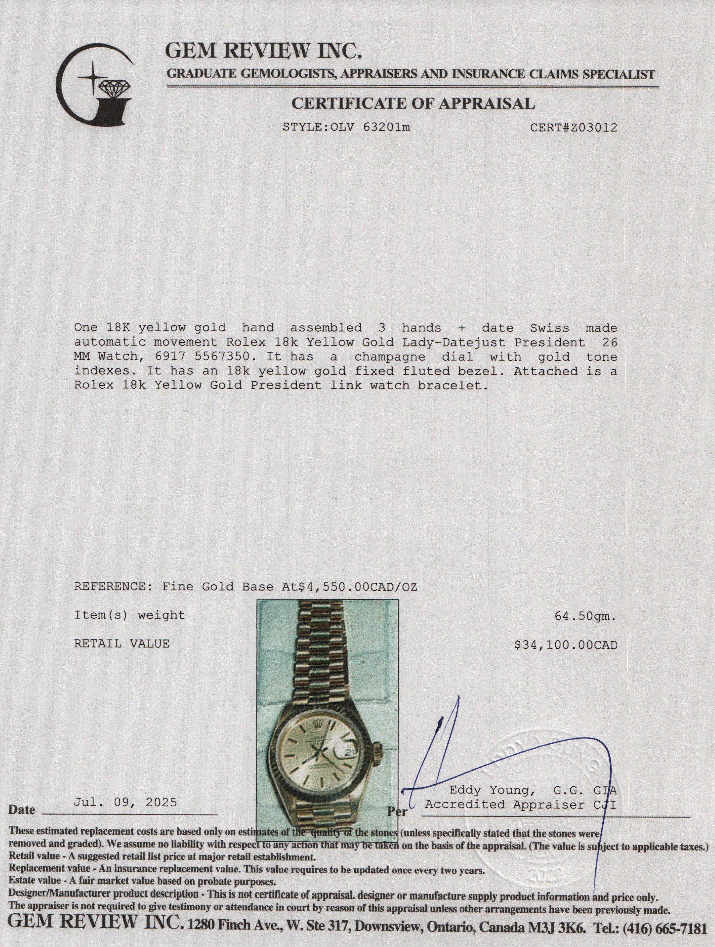 18k Yellow Gold Lady-Datejust President 26 MM Watch 6917 w/ Box & Paper