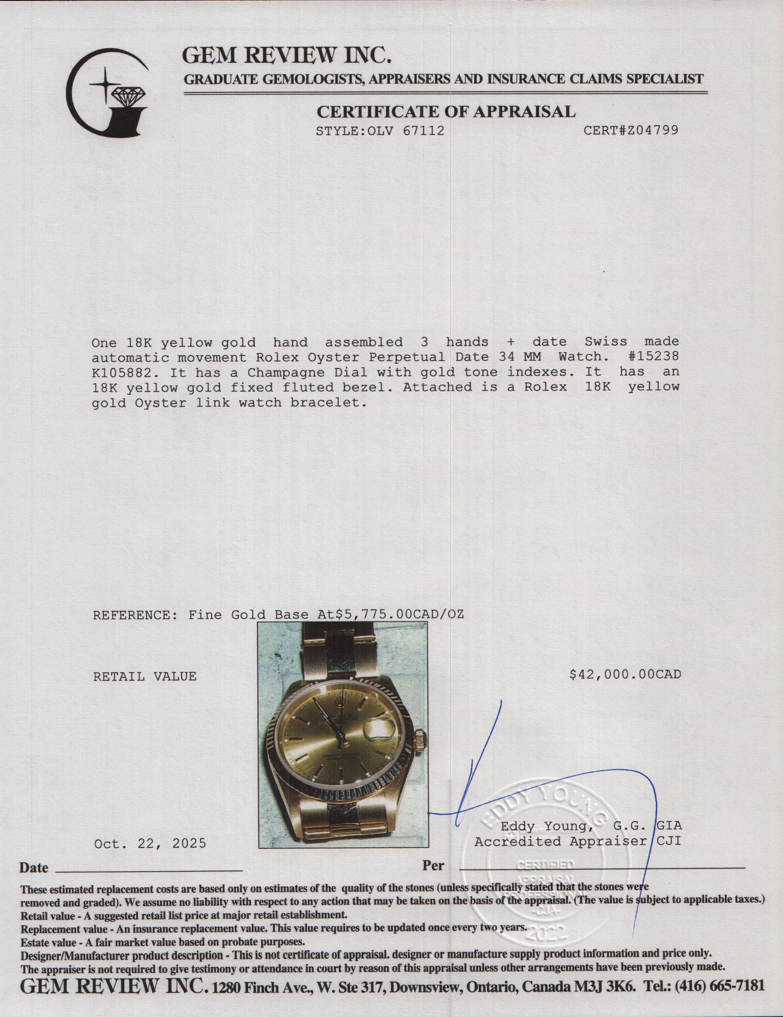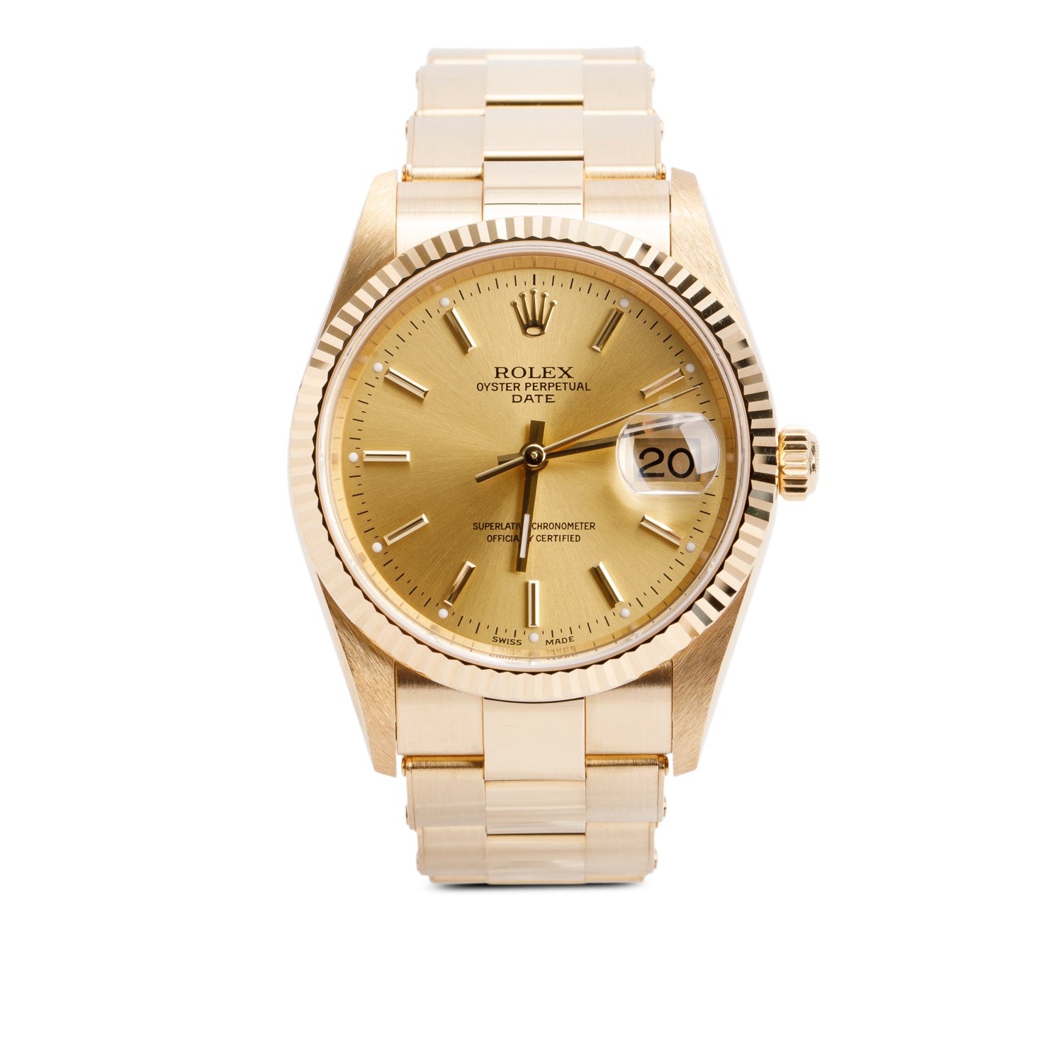 18k Yellow Gold Oyster Perpetual Date 34 MM Watch Champagne Dial 15238 w/ Box & Papers