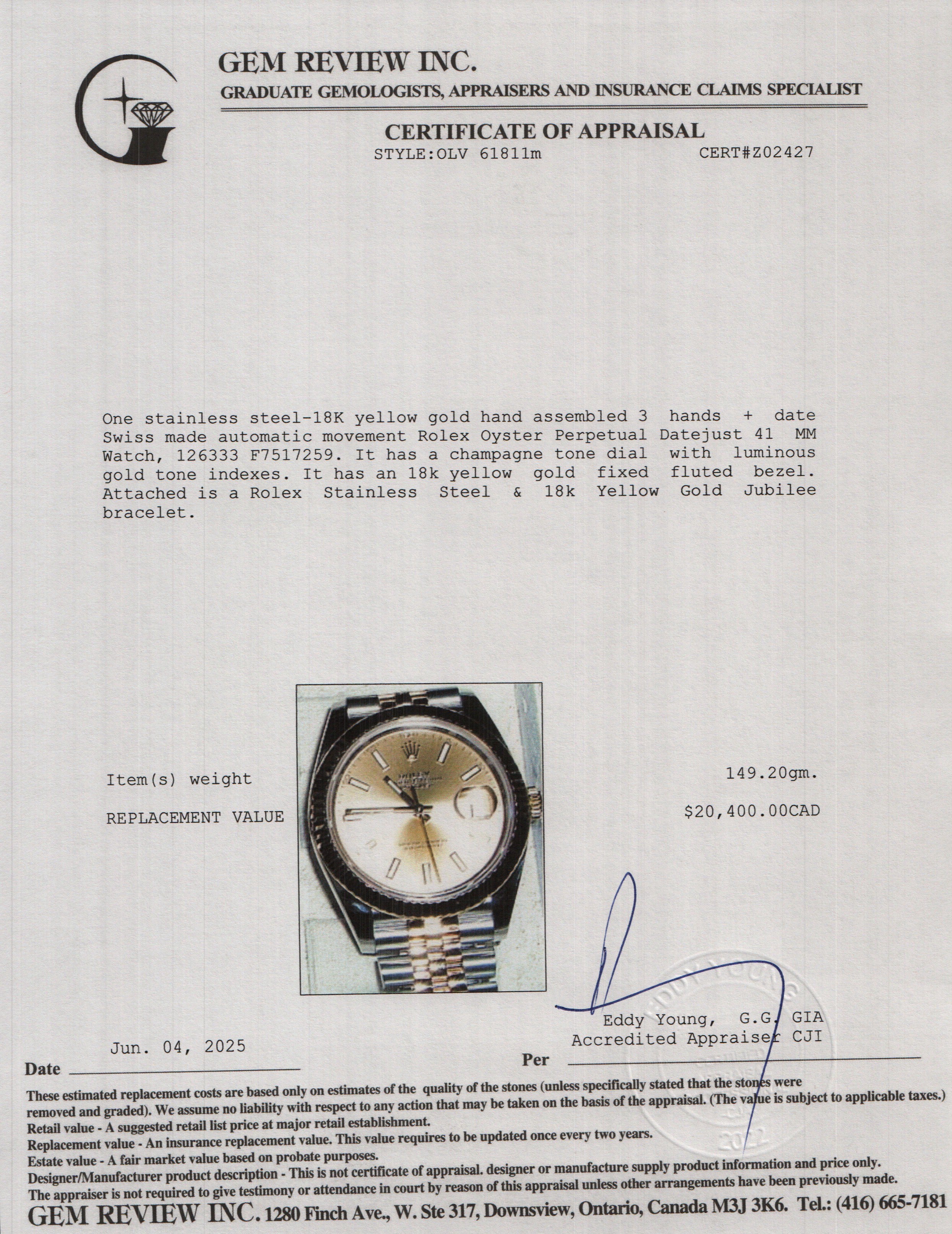 2021 Stainless Steel & 18k Yellow Gold Oyster Perpetual Datejust 41 MM Watch Gold Dial 126333 w/ Box & Papers