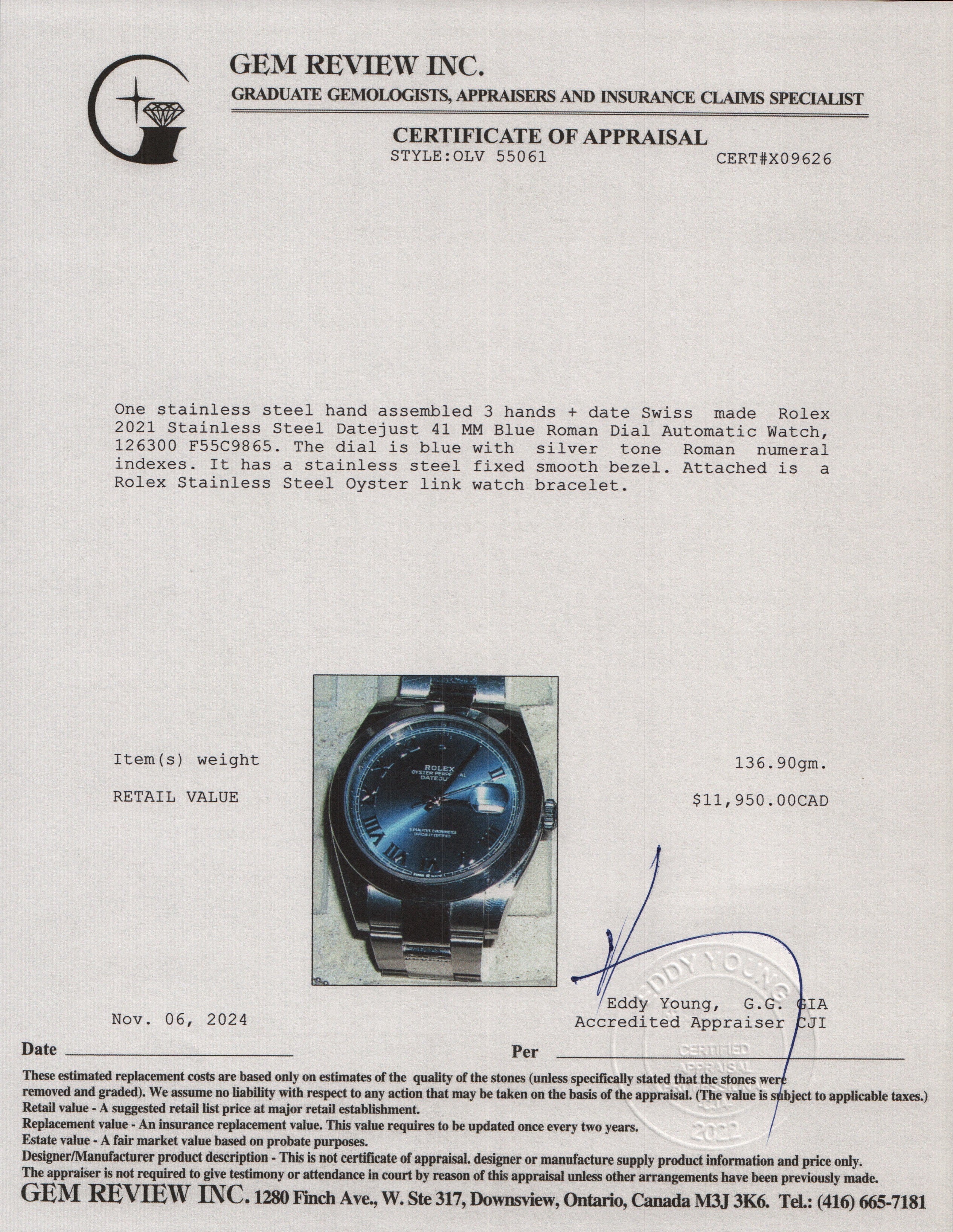 2021 Stainless Steel Datejust 41 MM Blue Roman Dial Automatic Watch 126300 w/ Box & Papers