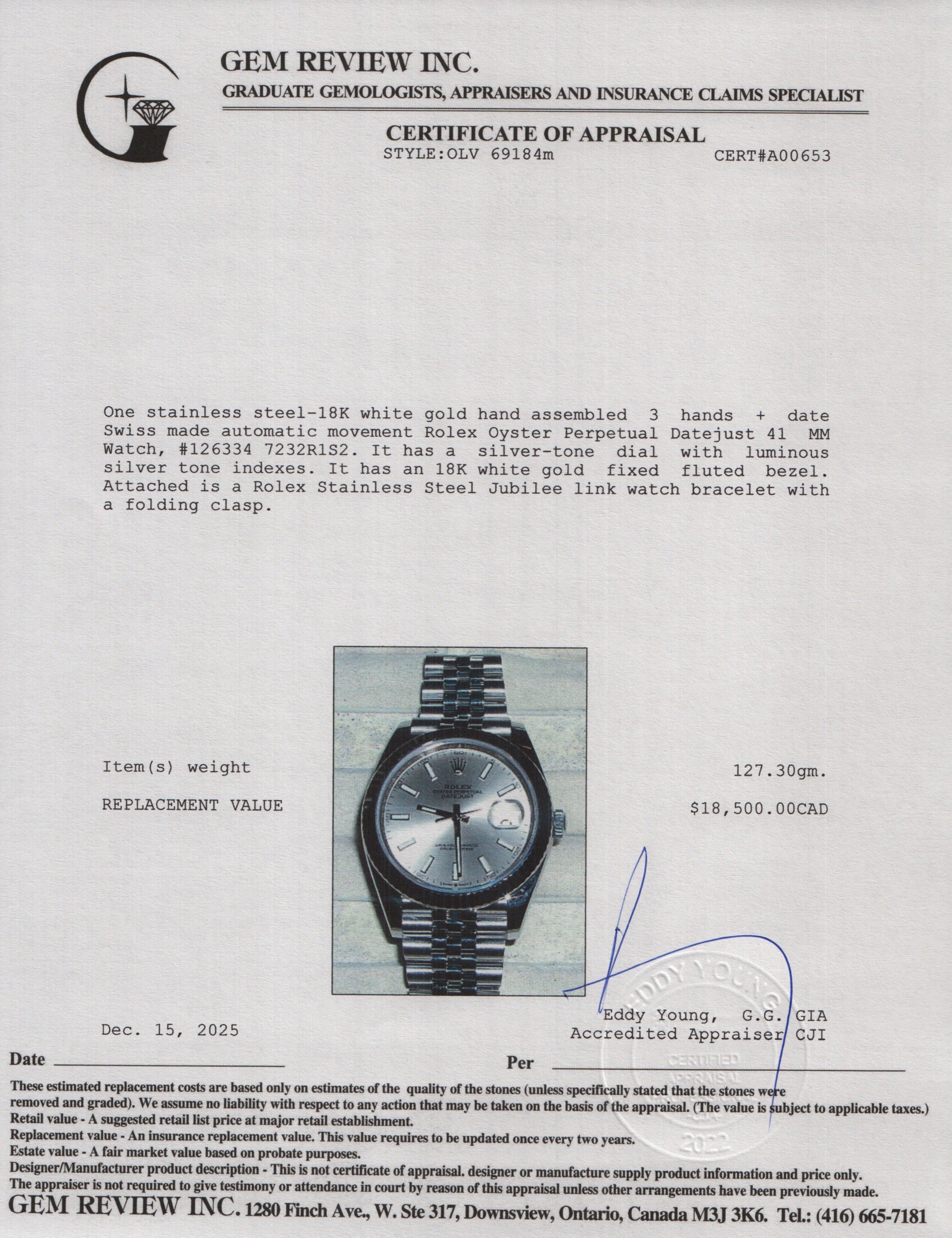 2021 Stainless Steel Oyster Perpetual Datejust 41 MM Watch Silver Dial 126334 w/ Box & Papers