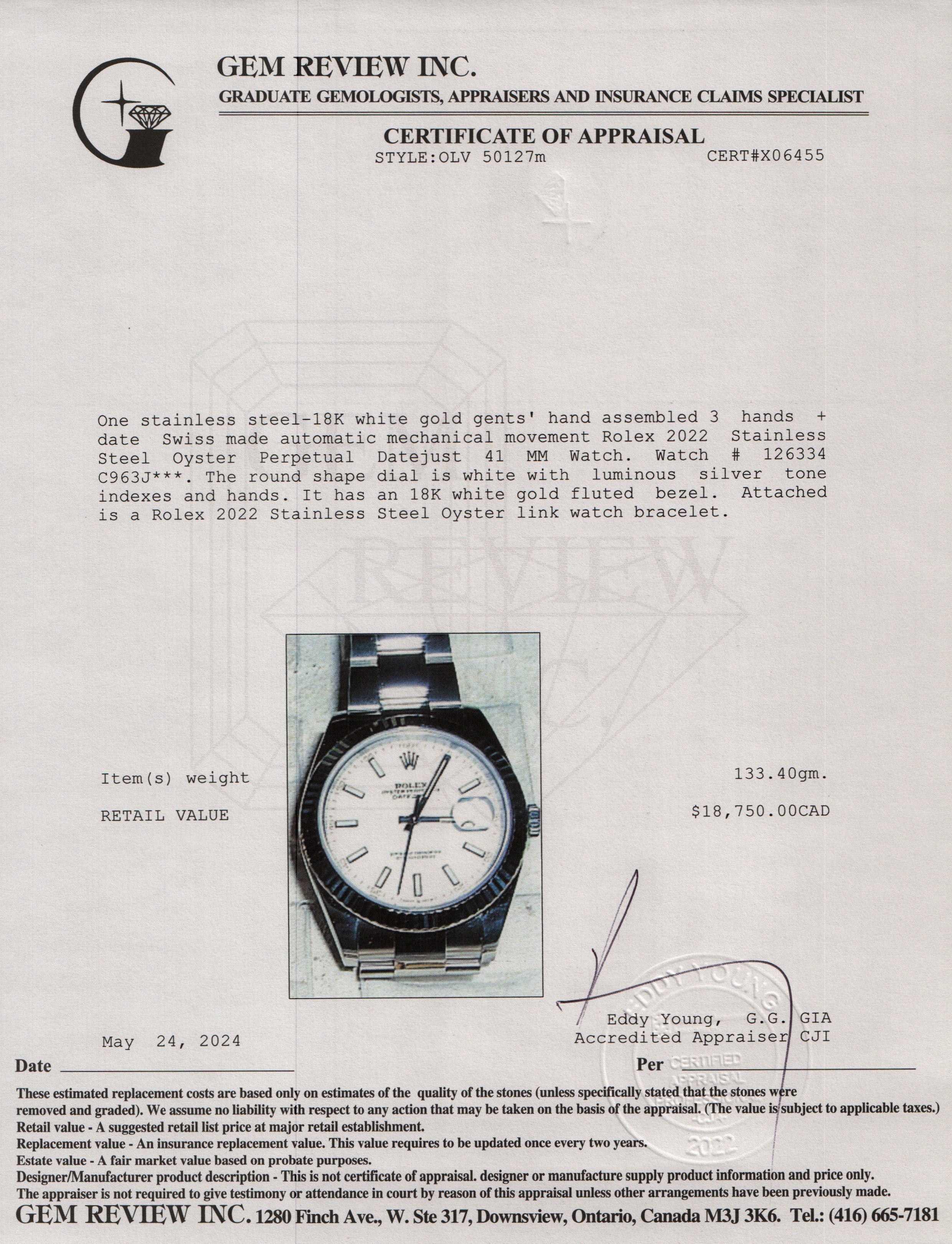 2022 Stainless Steel Oyster Perpetual Datejust 41 MM Watch 126334 w/ Box & Papers
