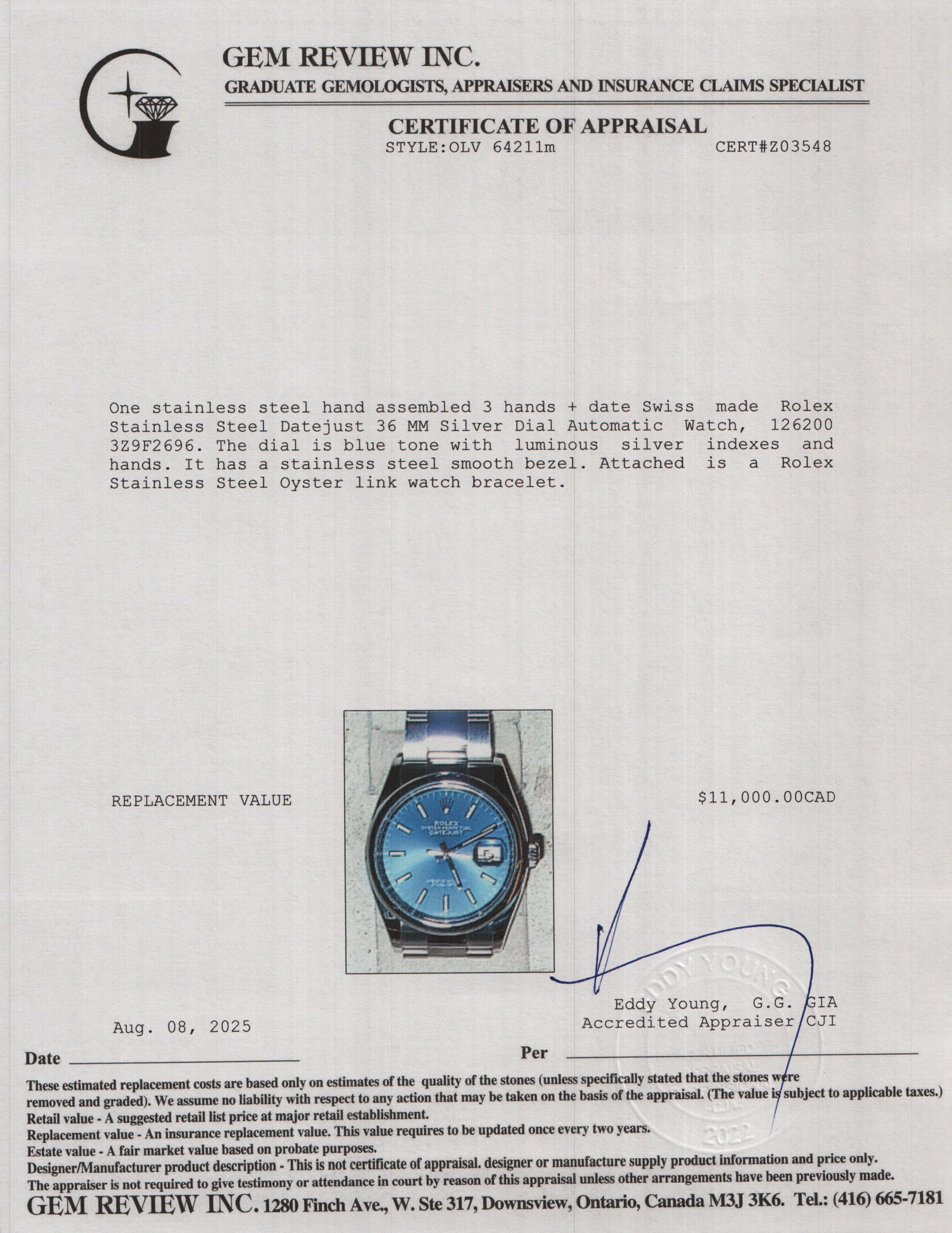 2023 Stainless Steel Datejust 36 MM Automatic Watch Blue Dial 126200 w/ Box & Papers