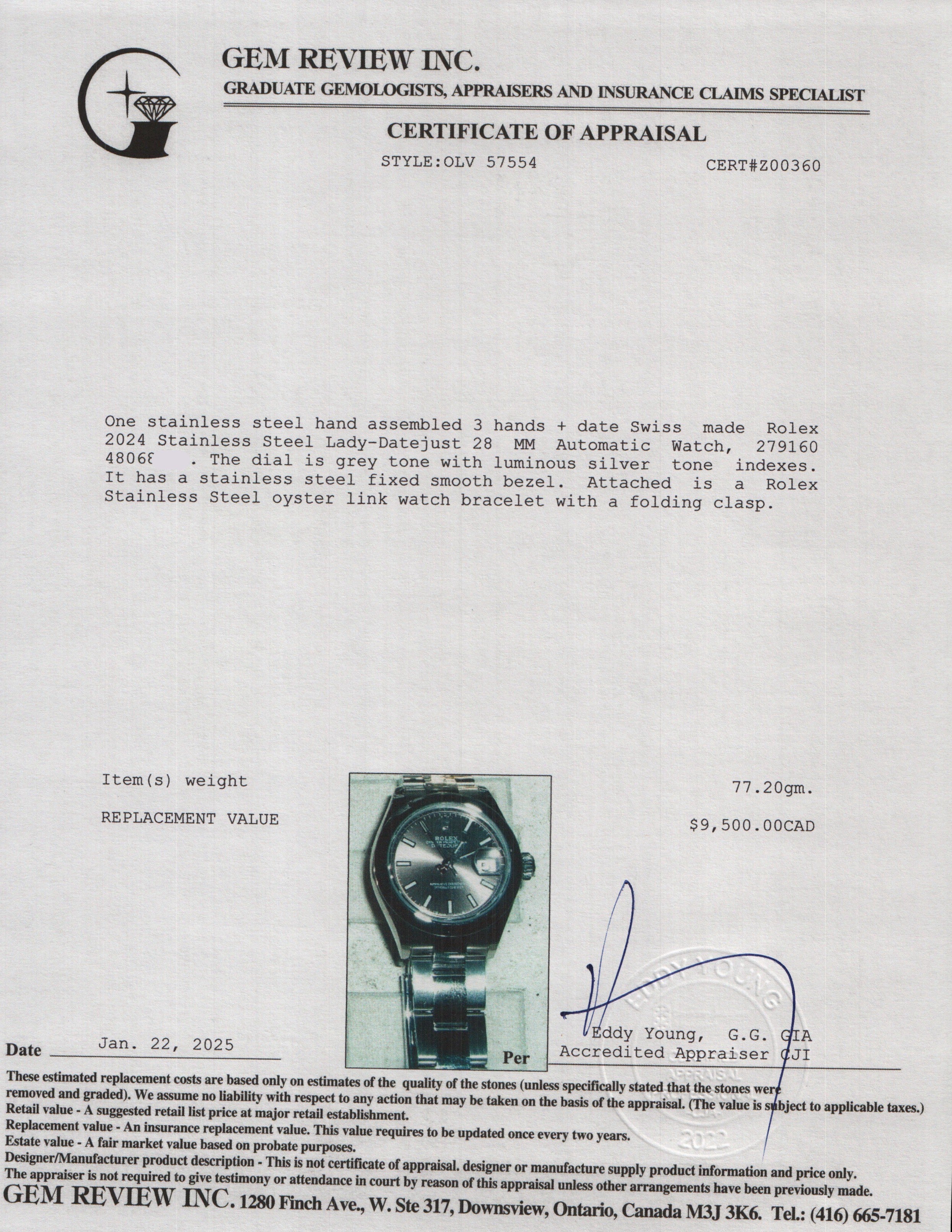 2024 Stainless Steel Lady-Datejust 28 MM Automatic Watch Dark Grey Dial 279160 w/ Box & Papers