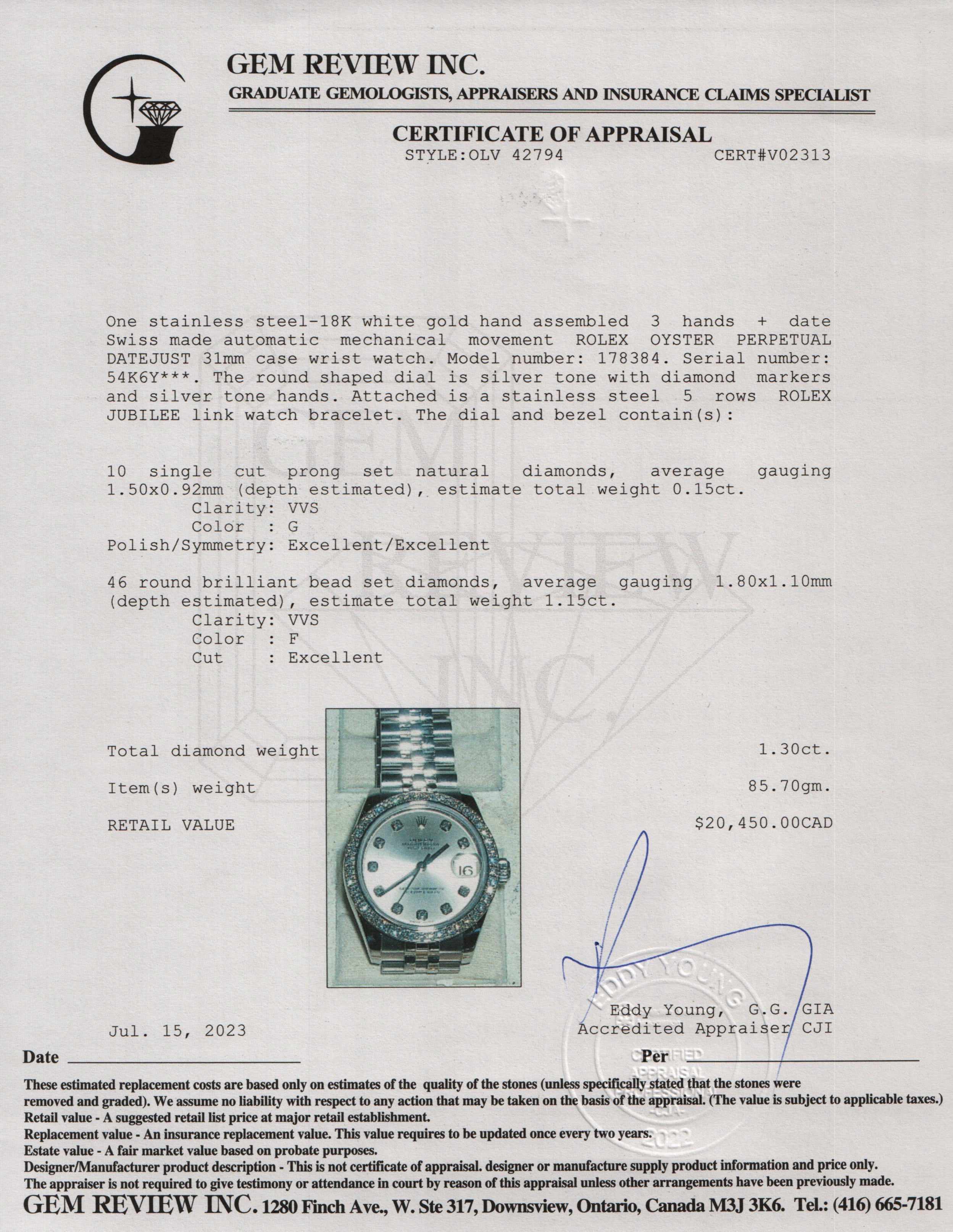 Included Items: Original Rolex Box, Card, Booklets & Gem Review Appraisal