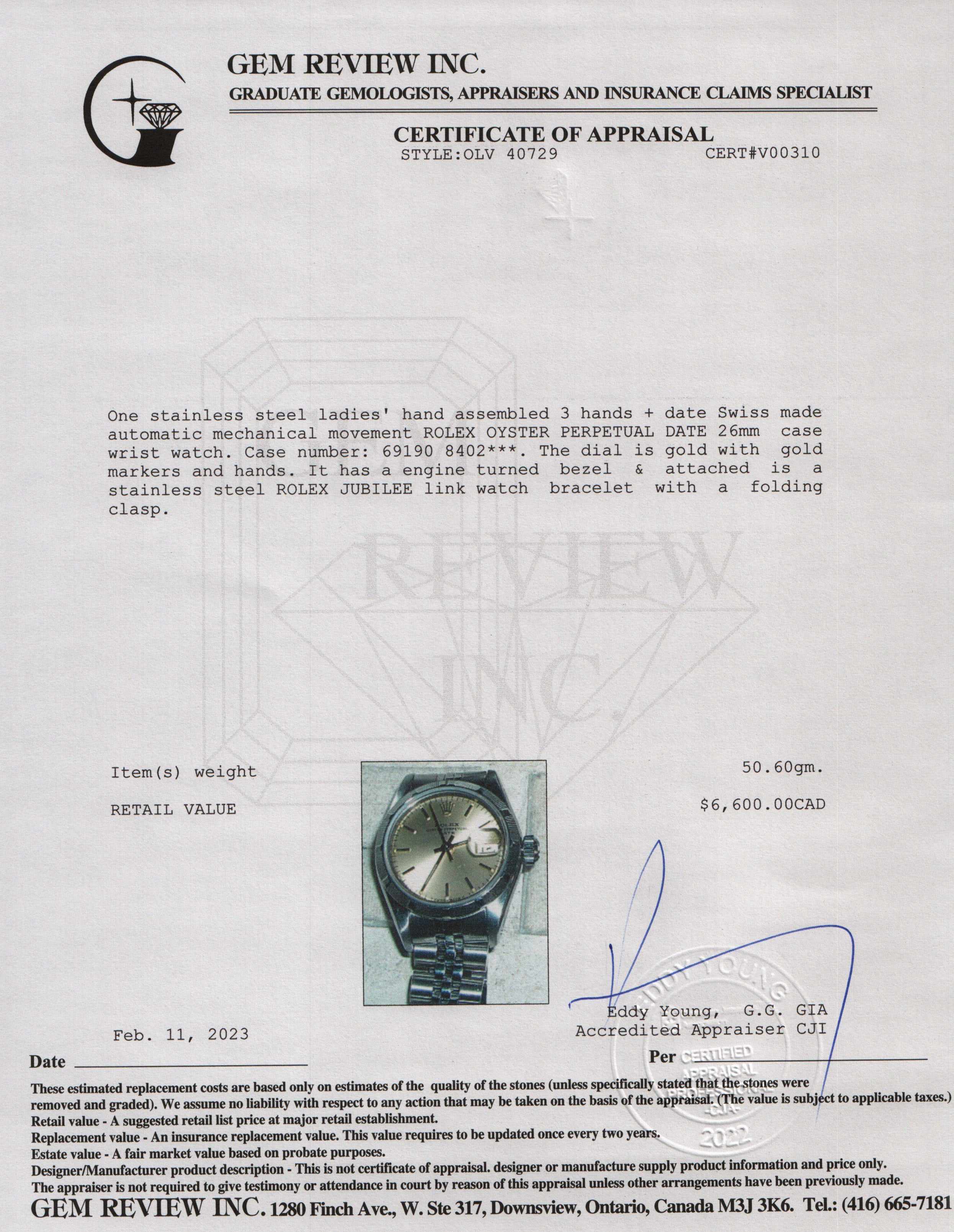 Included Items: Original Rolex Box, Booklets, Papers & Gem Review Appraisal