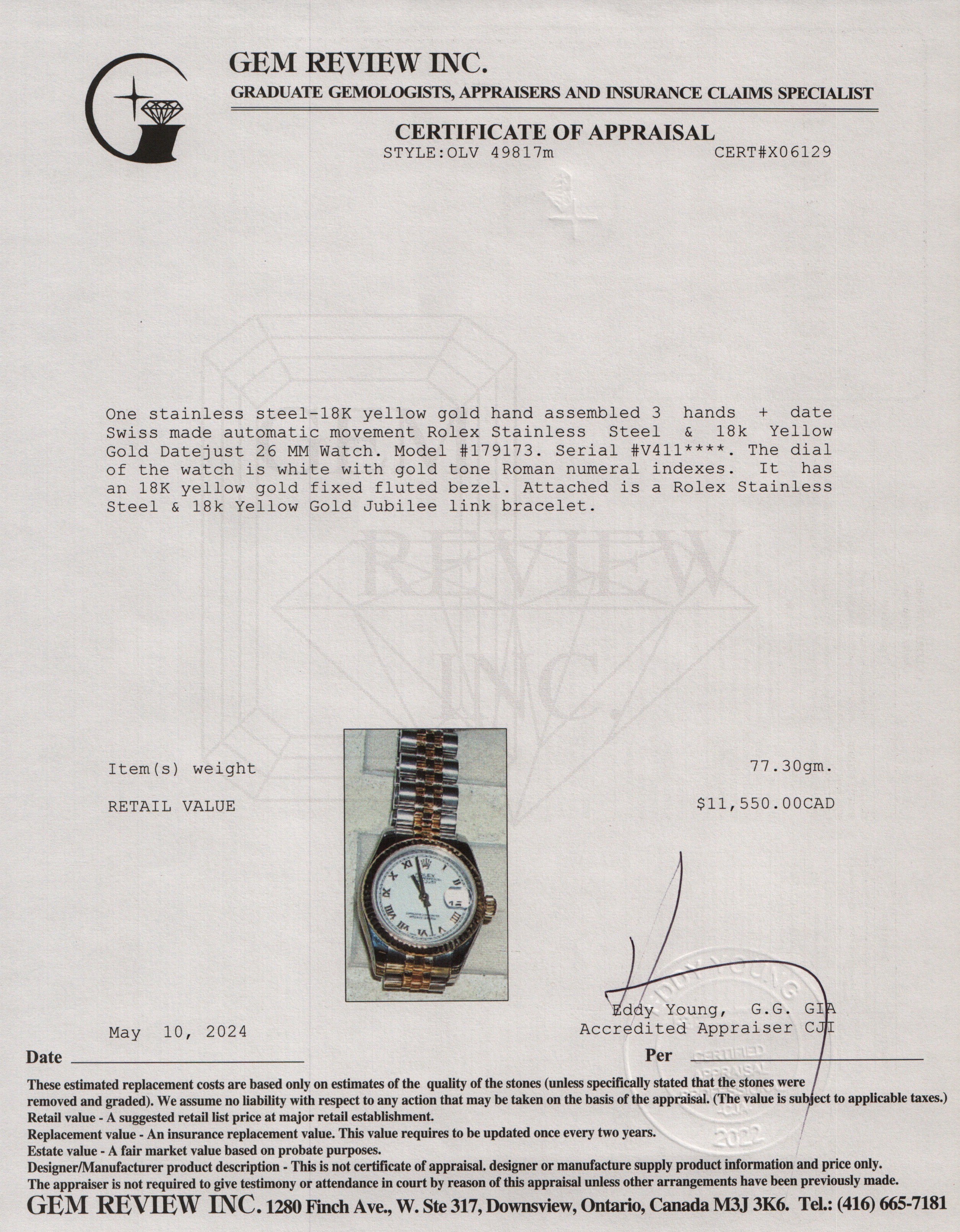 Stainless Steel & 18k Yellow Gold Datejust 26 MM Watch 179173