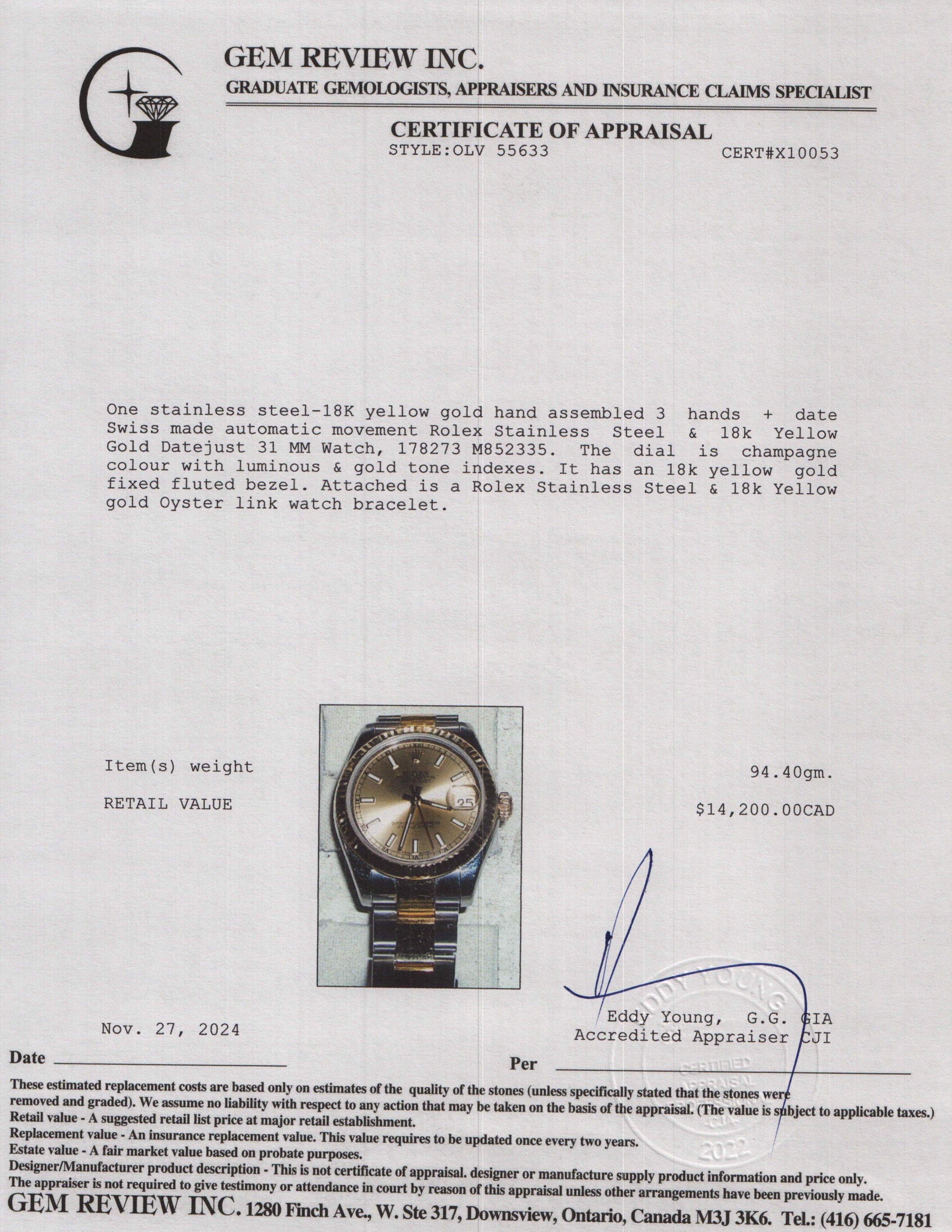 Stainless Steel & 18k Yellow Gold Datejust 31 MM Watch 178273