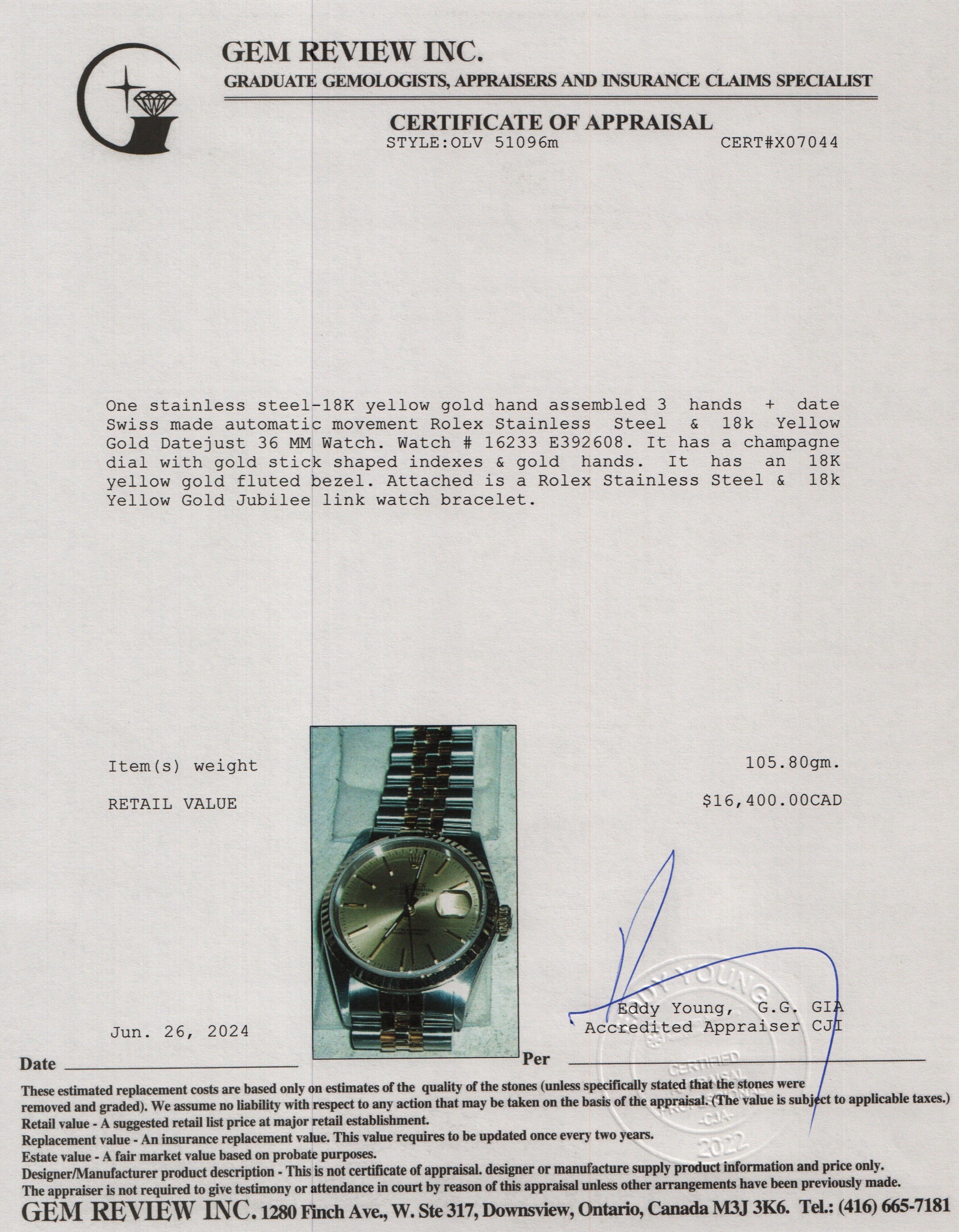 Stainless Steel & 18k Yellow Gold Datejust 36 MM Watch 16233 w/ Box & Papers