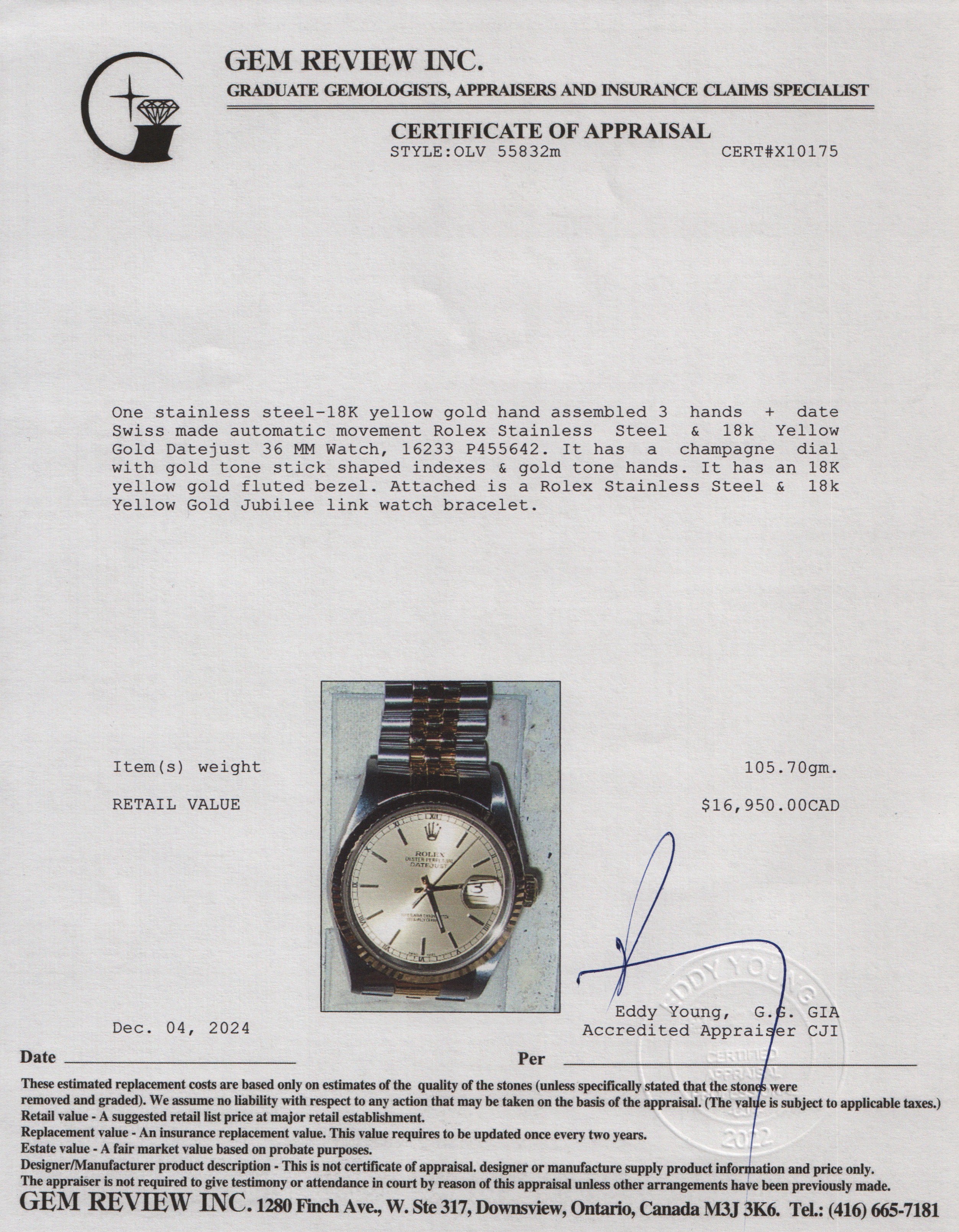 Stainless Steel & 18k Yellow Gold Datejust 36 MM Watch 16233 w/ Box & Papers