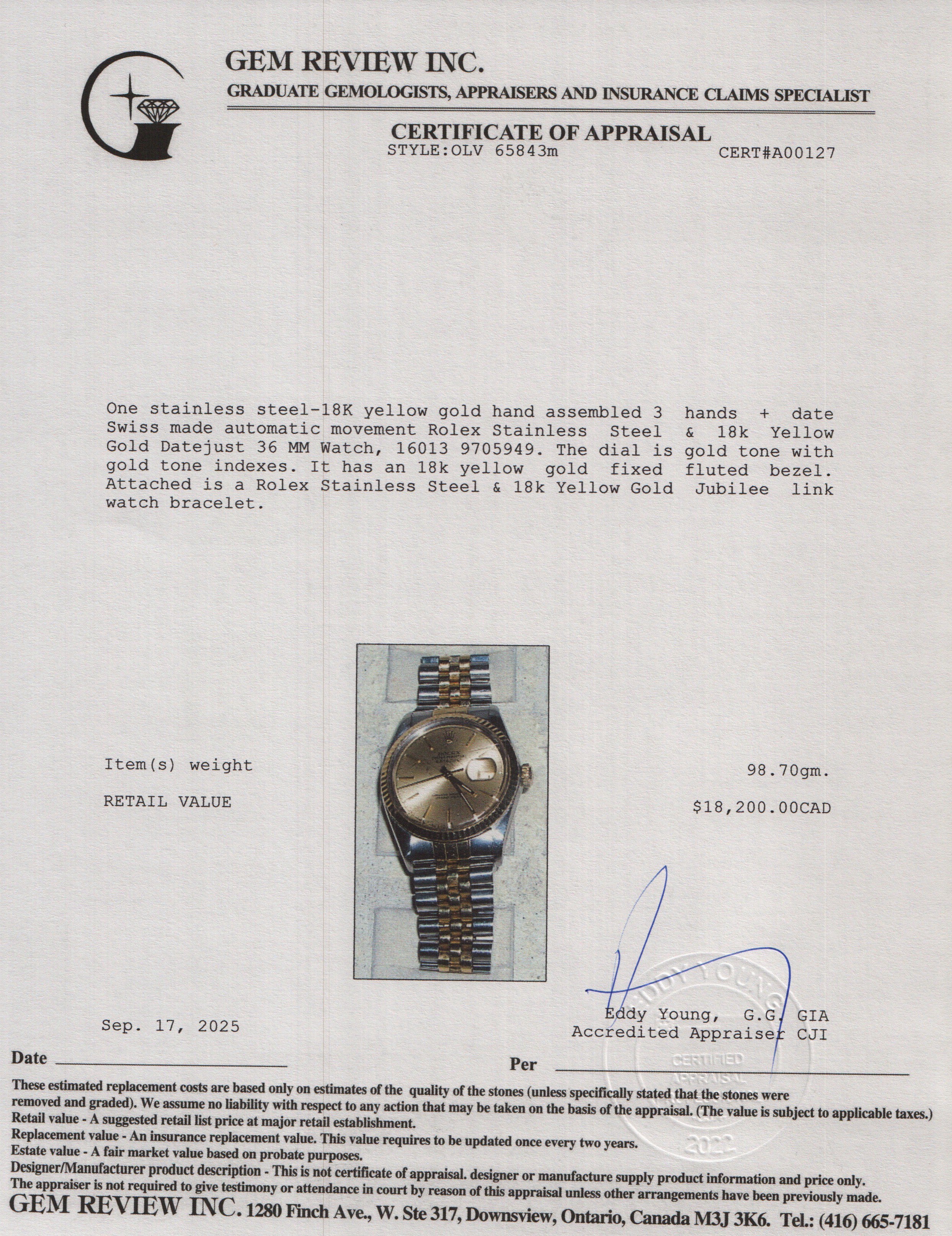 Stainless Steel & 18k Yellow Gold Datejust 36 MM Watch Gold Dial 16013 w/ Box