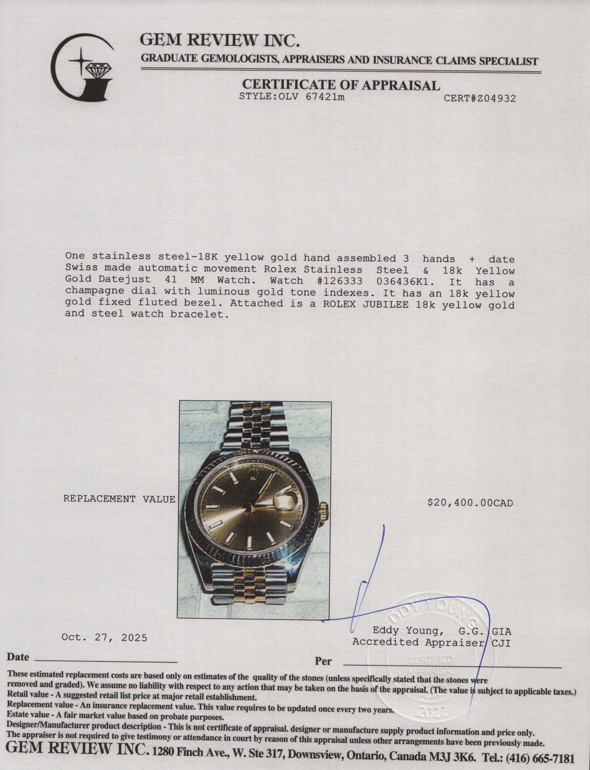 Stainless Steel & 18k Yellow Gold Datejust 41 MM Automatic Watch 126333 w/ Box