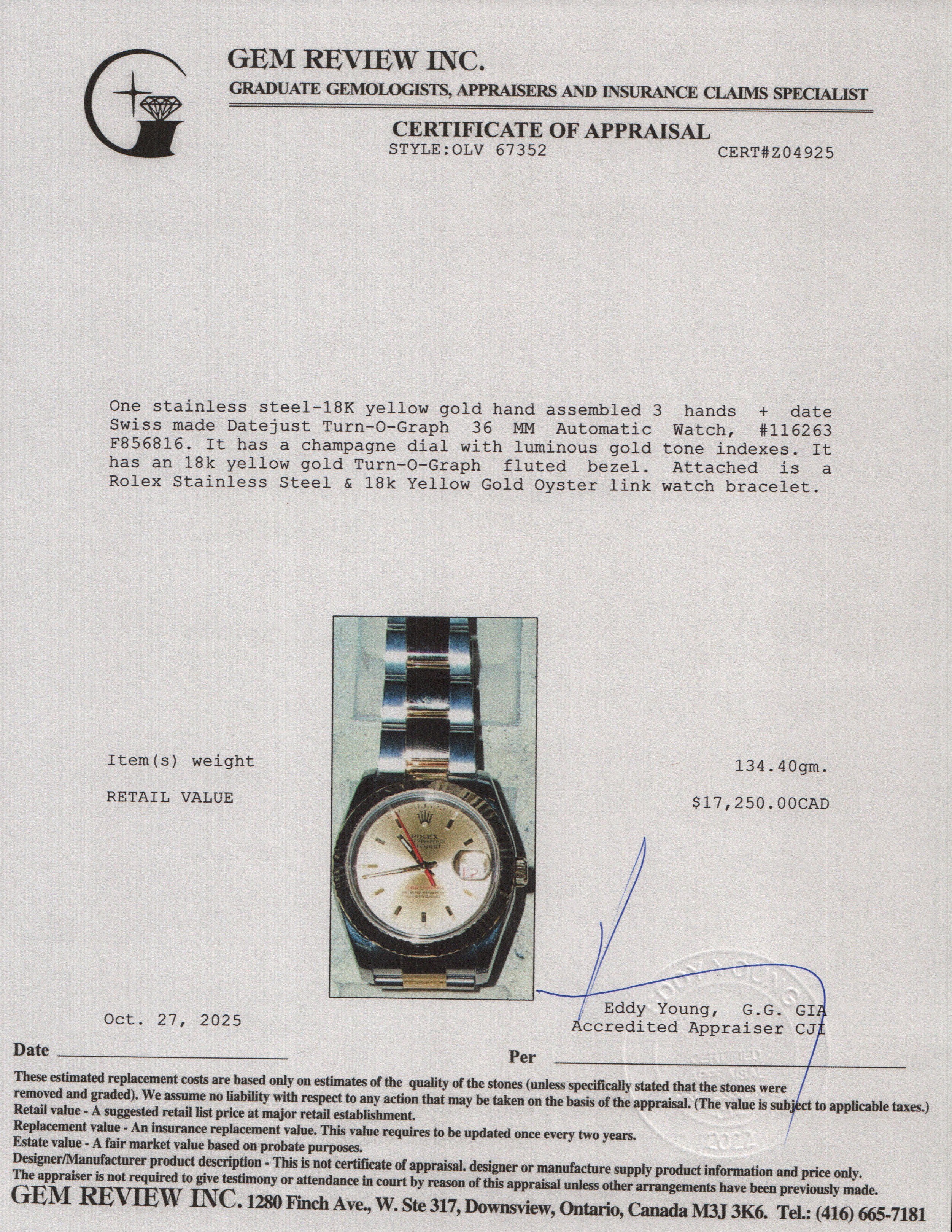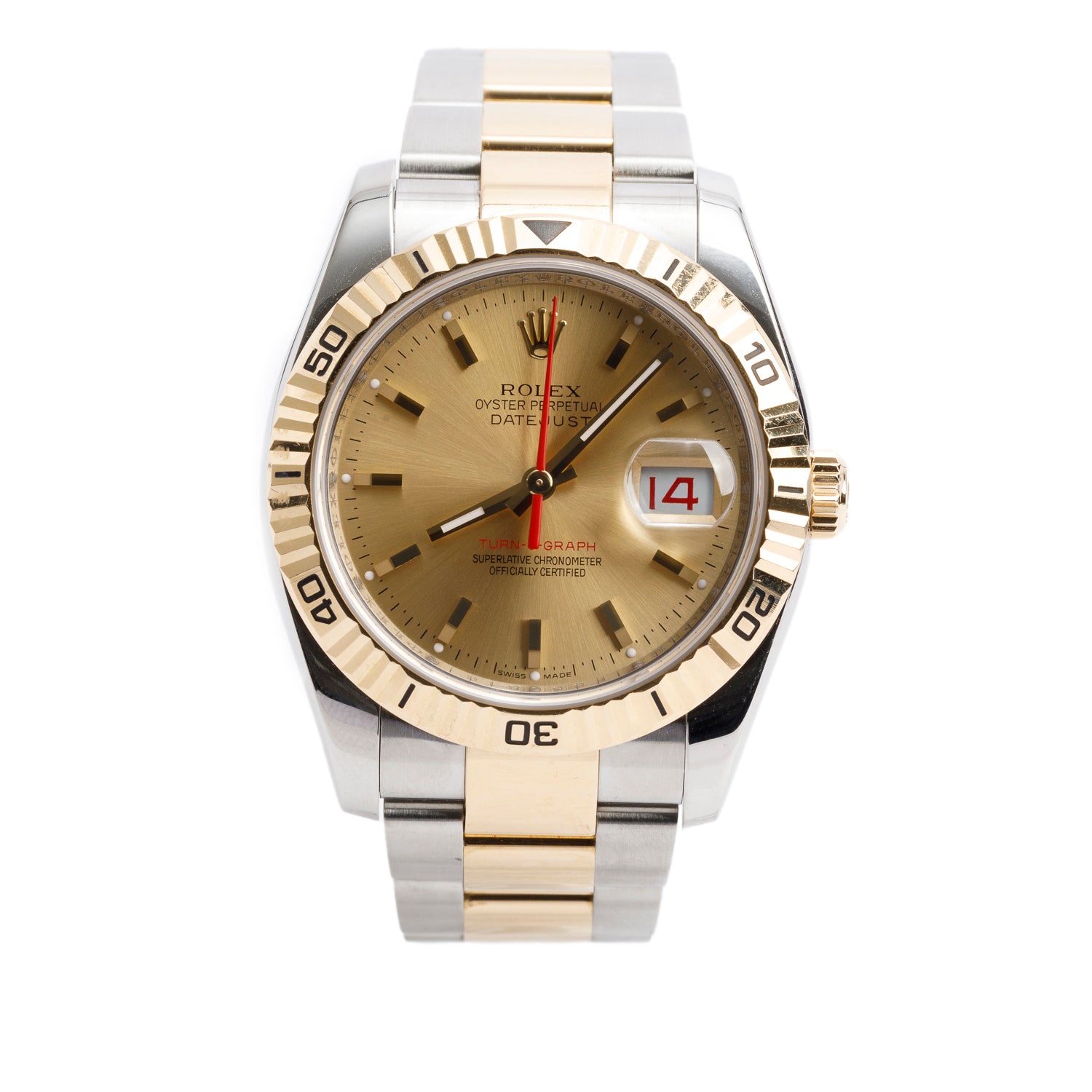 Stainless Steel & 18k Yellow Gold Datejust Turn-O-Graph 36 MM Automatic Watch Gold Dial 116263 w/ Box & Papers