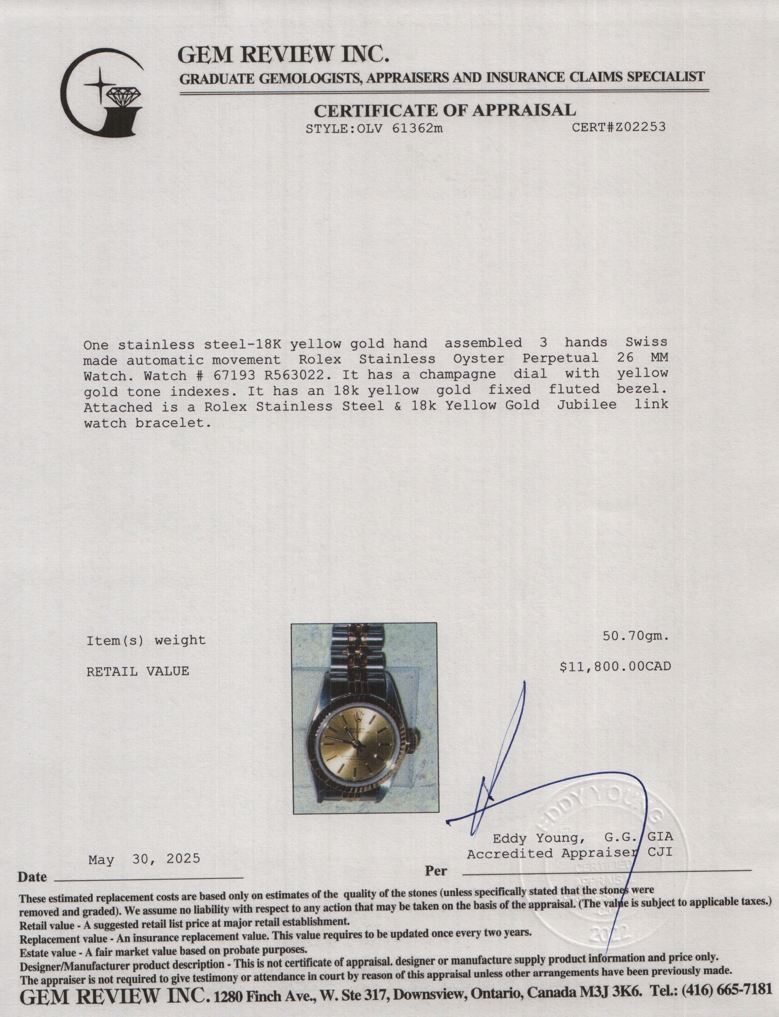 Stainless Steel & 18k Yellow Gold Oyster Perpetual 26 MM Watch Gold Dial 67193