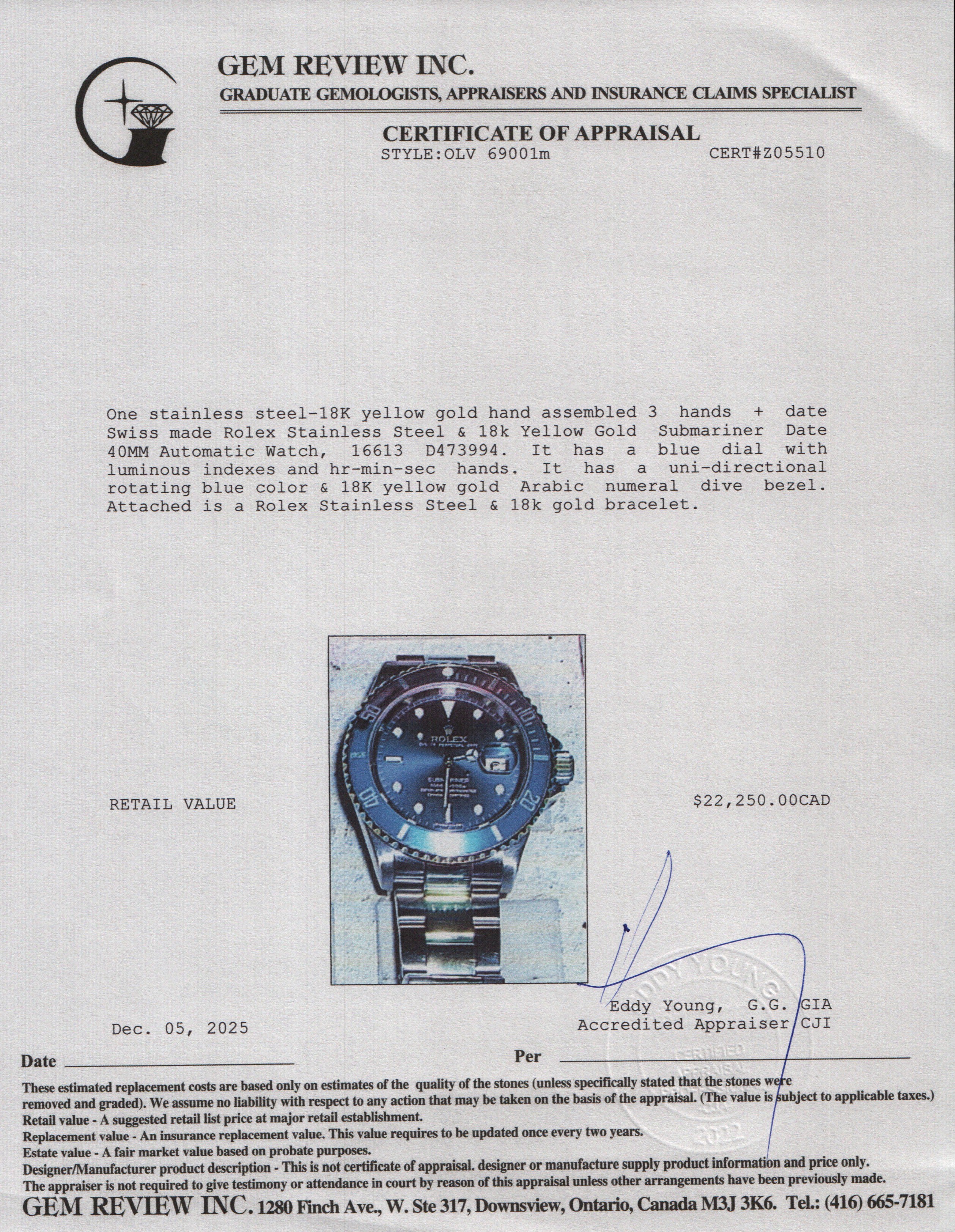 Stainless Steel & 18k Yellow Gold Submariner Date 40 MM Automatic Watch Blue Dial 16613 w/ Box & Papers