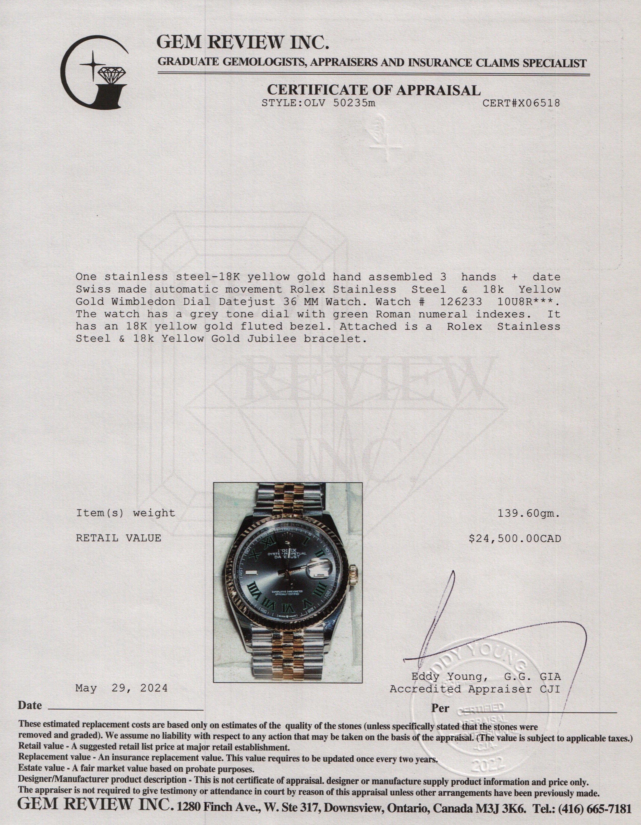 Stainless Steel & 18k Yellow Gold Wimbledon Dial Datejust 36 MM Watch 126233 w/ Box & Papers