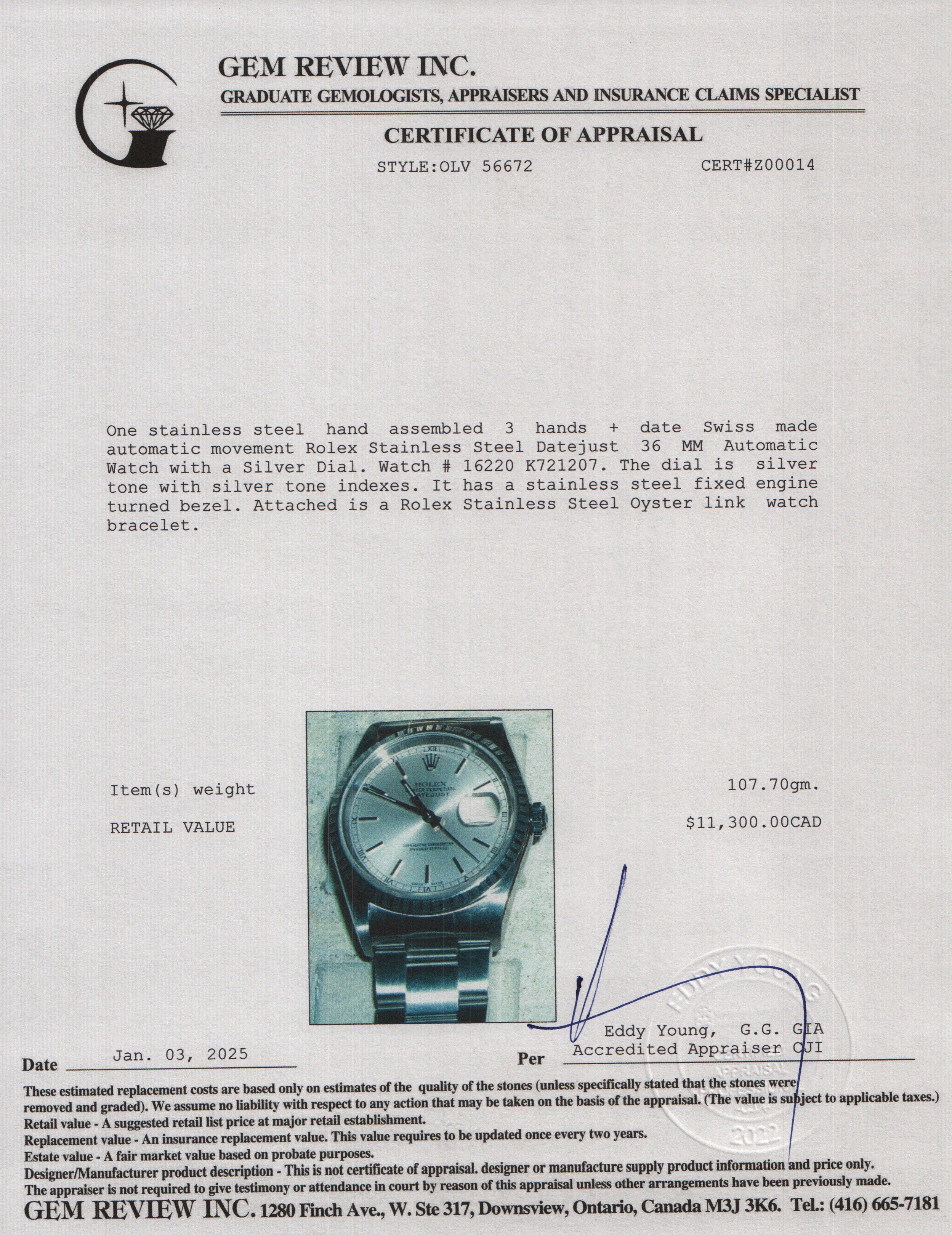 Stainless Steel Datejust 36 MM Automatic Watch Silver Dial 16220 w/ Box & Papers