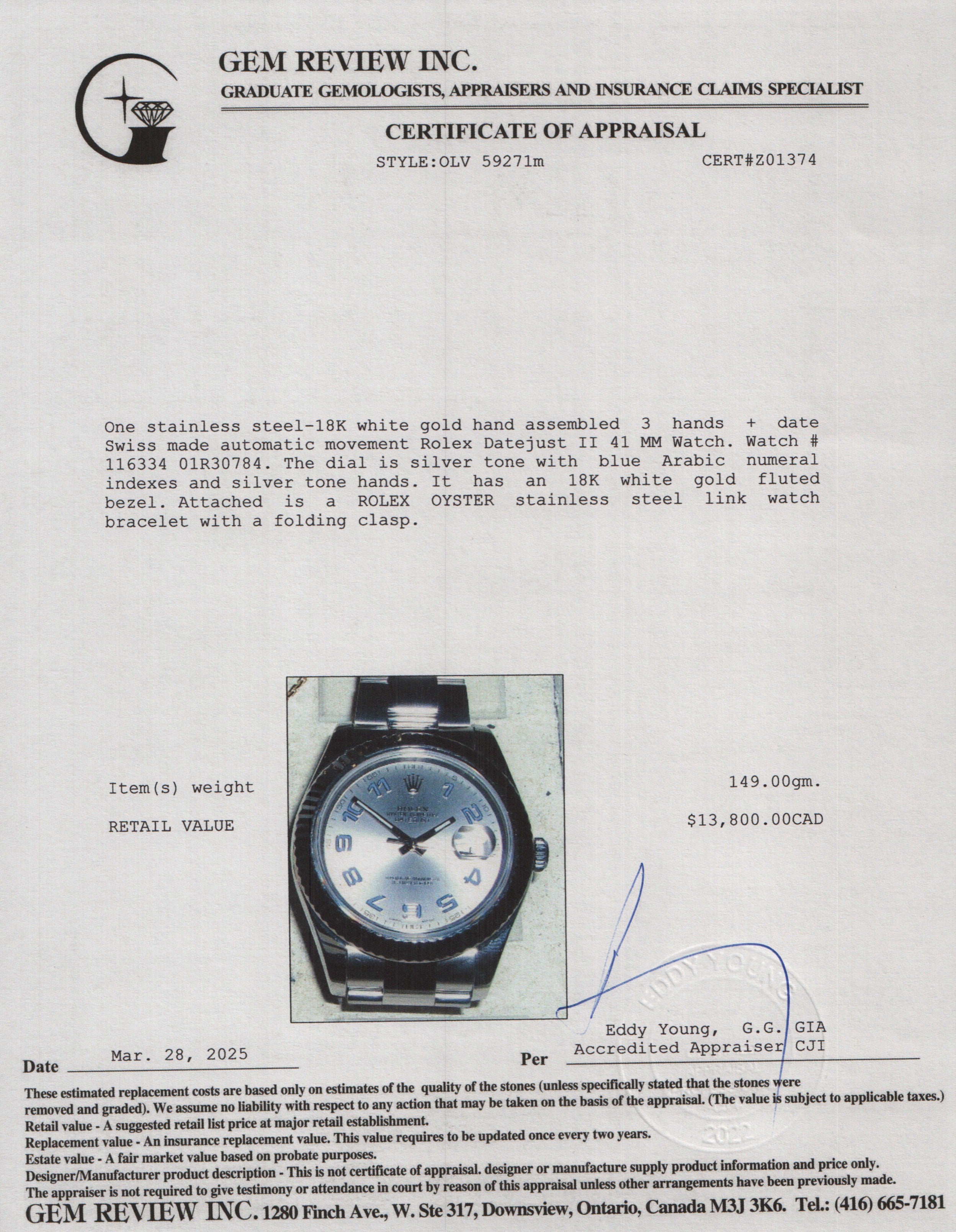 Stainless Steel Datejust II 41 MM Watch 116334 w/ Box & Papers
