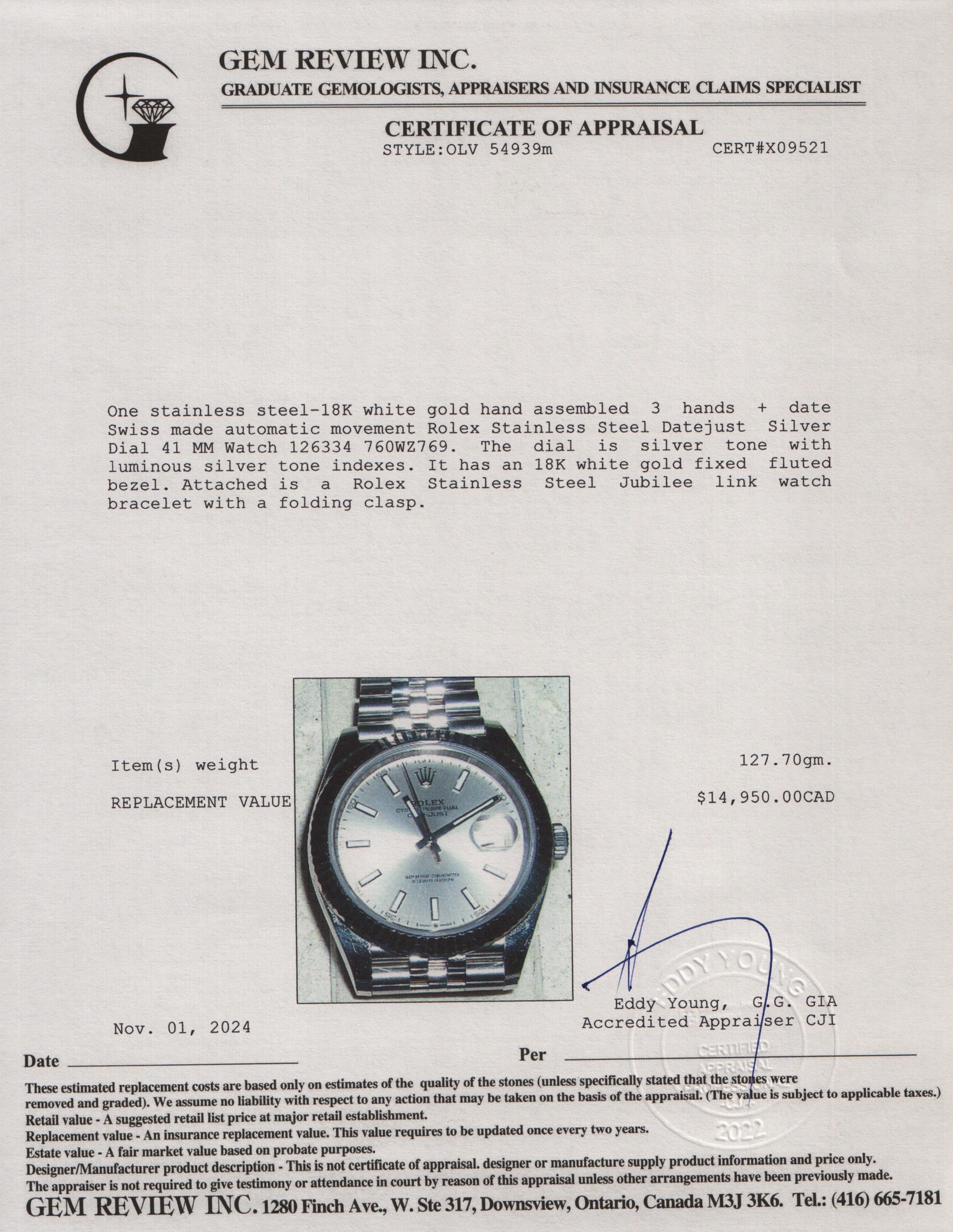 Stainless Steel Datejust Silver Dial 41 MM Watch 126334 w/ Box & Papers