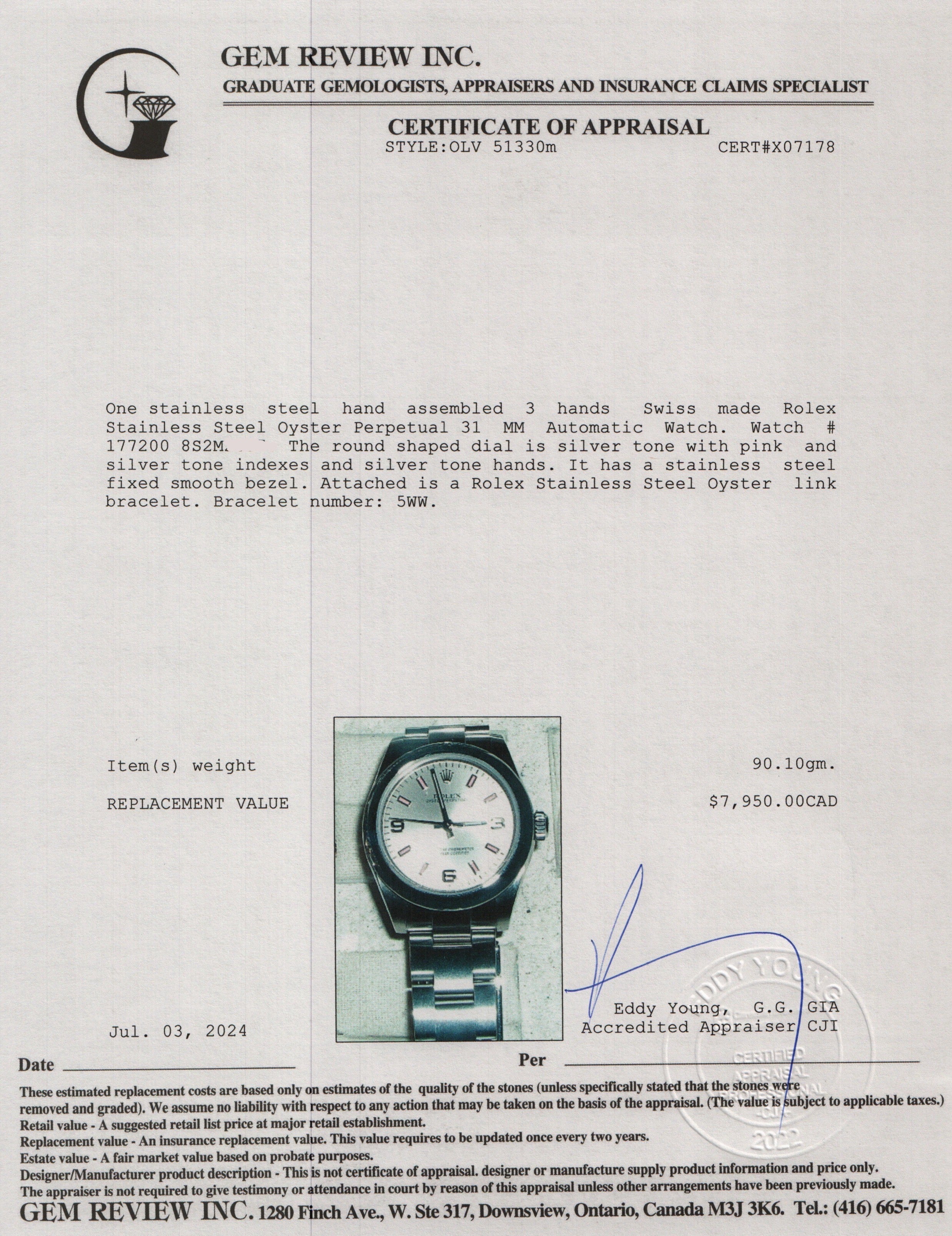 Stainless Steel Oyster Perpetual 31 MM Automatic Watch 177200 w/ Box & Papers
