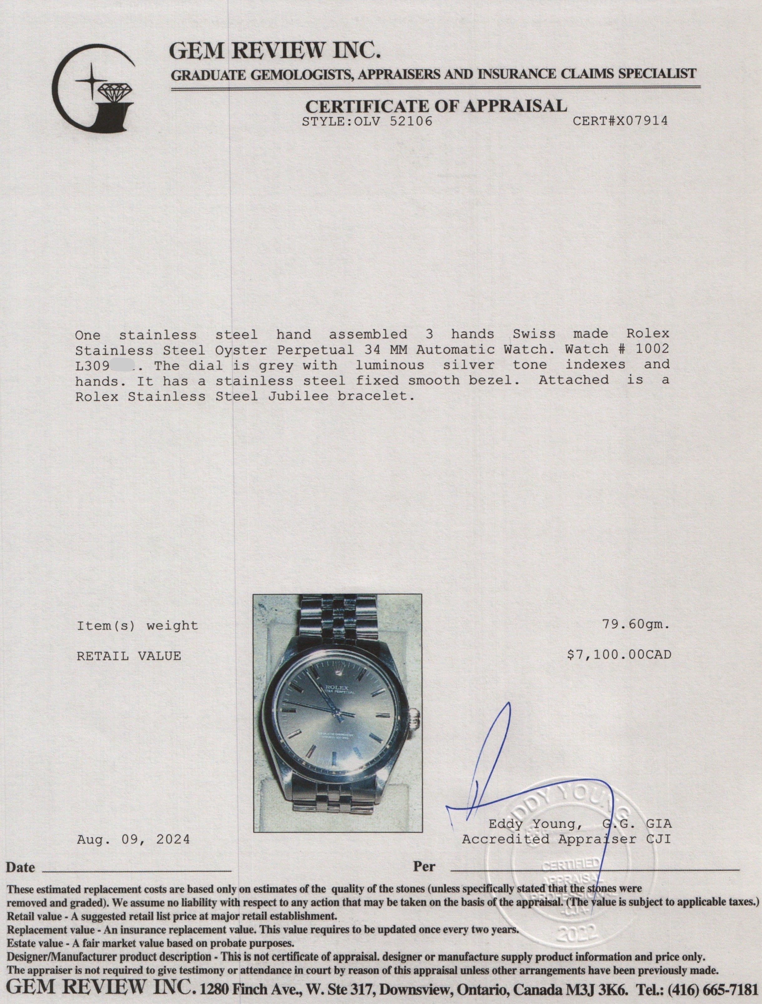 Stainless Steel Oyster Perpetual 34 MM Automatic Watch 1002 w/ Box