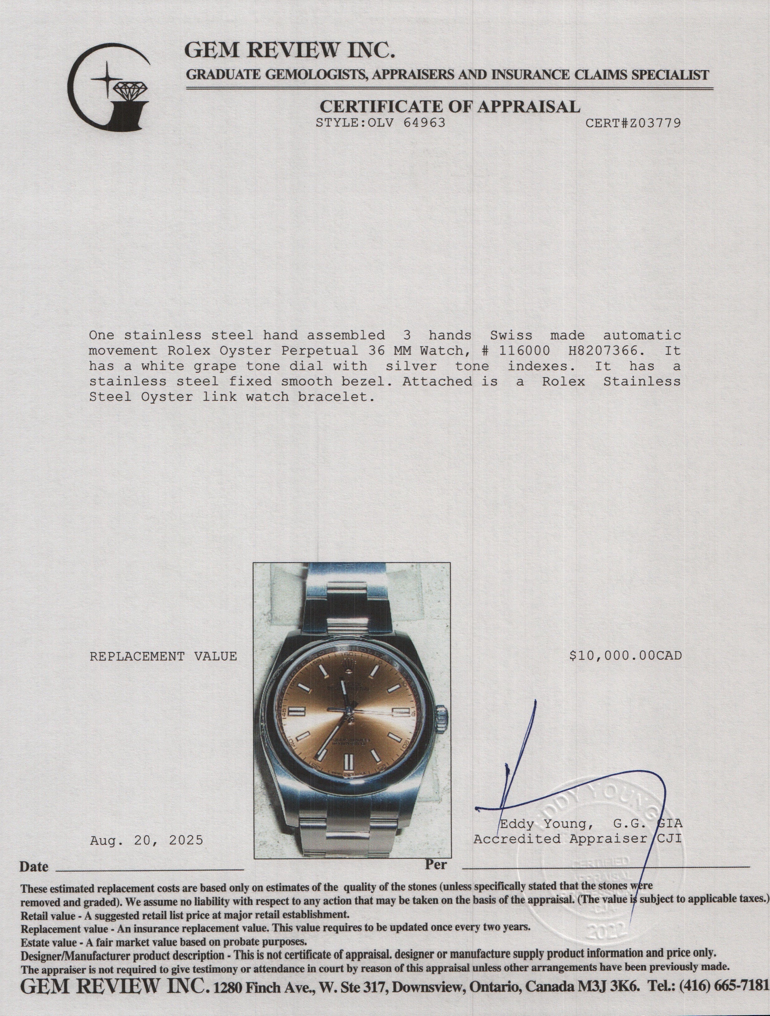 Stainless Steel Oyster Perpetual 36 MM Watch White GrapeDial 116000 w/ Box & Papers