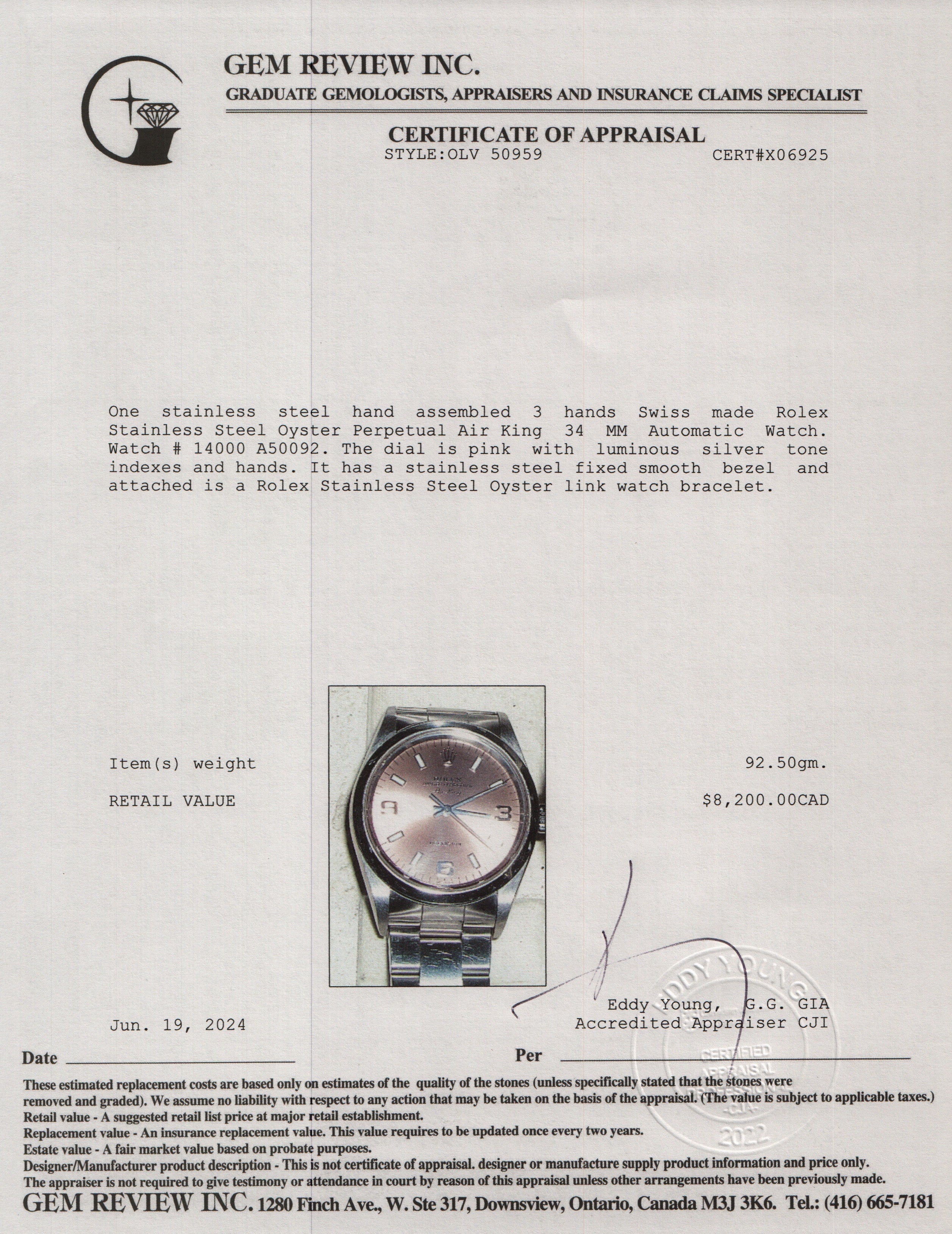 Stainless Steel Oyster Perpetual Air King 34 MM Automatic Watch 14000