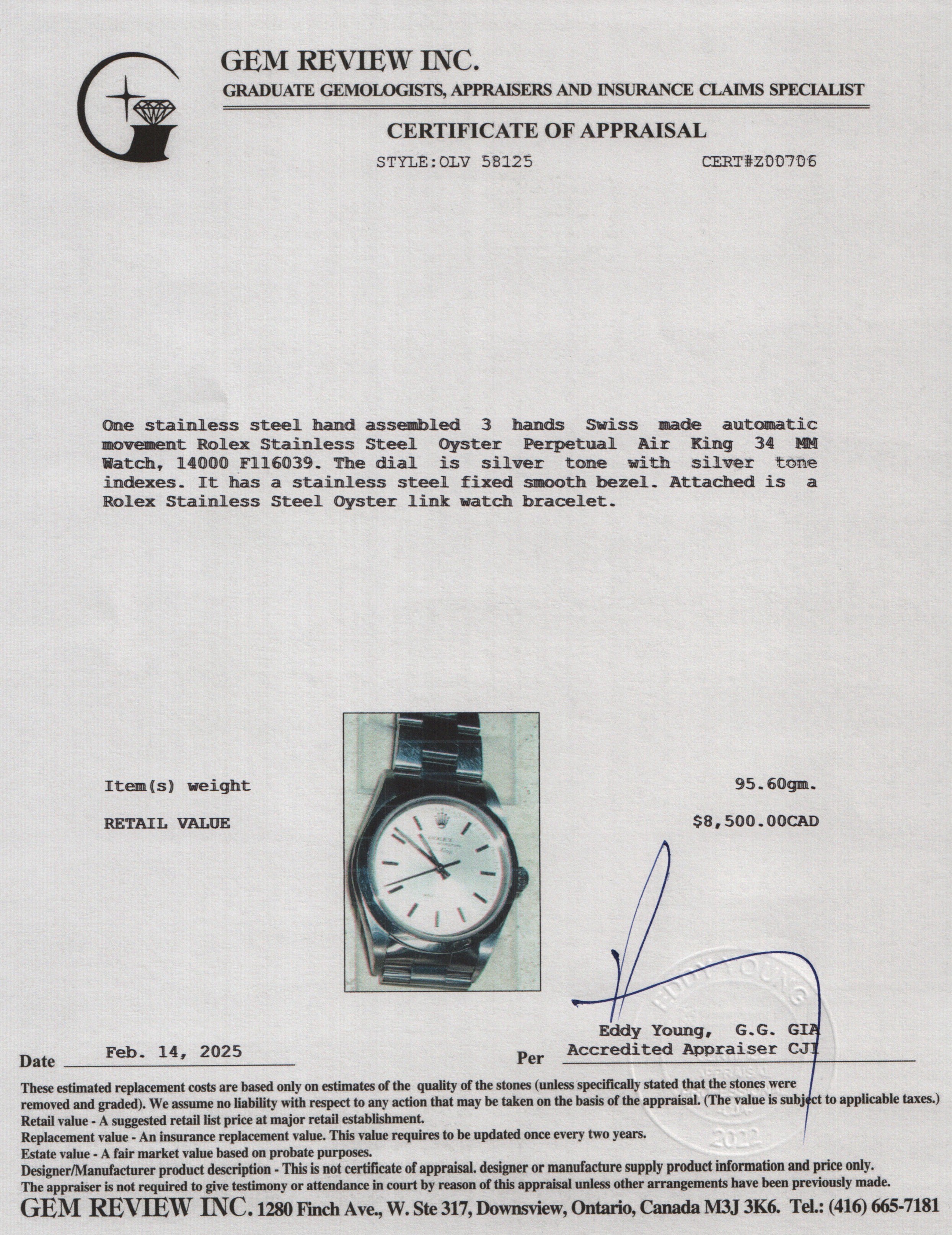 Stainless Steel Oyster Perpetual Air King 34 MM Watch 14000