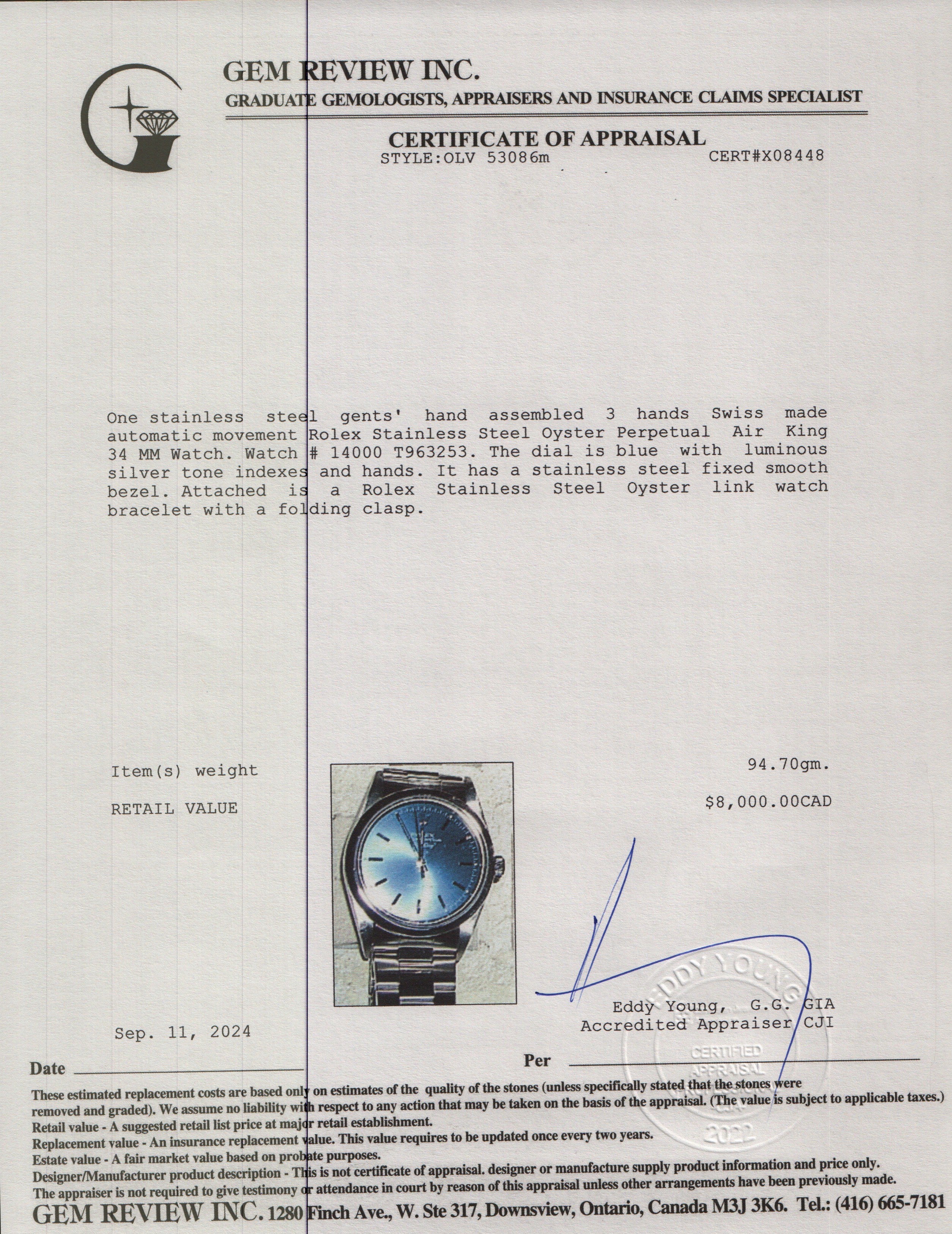 Stainless Steel Oyster Perpetual Air King 34 MM Watch 14000 w/ Box & Papers