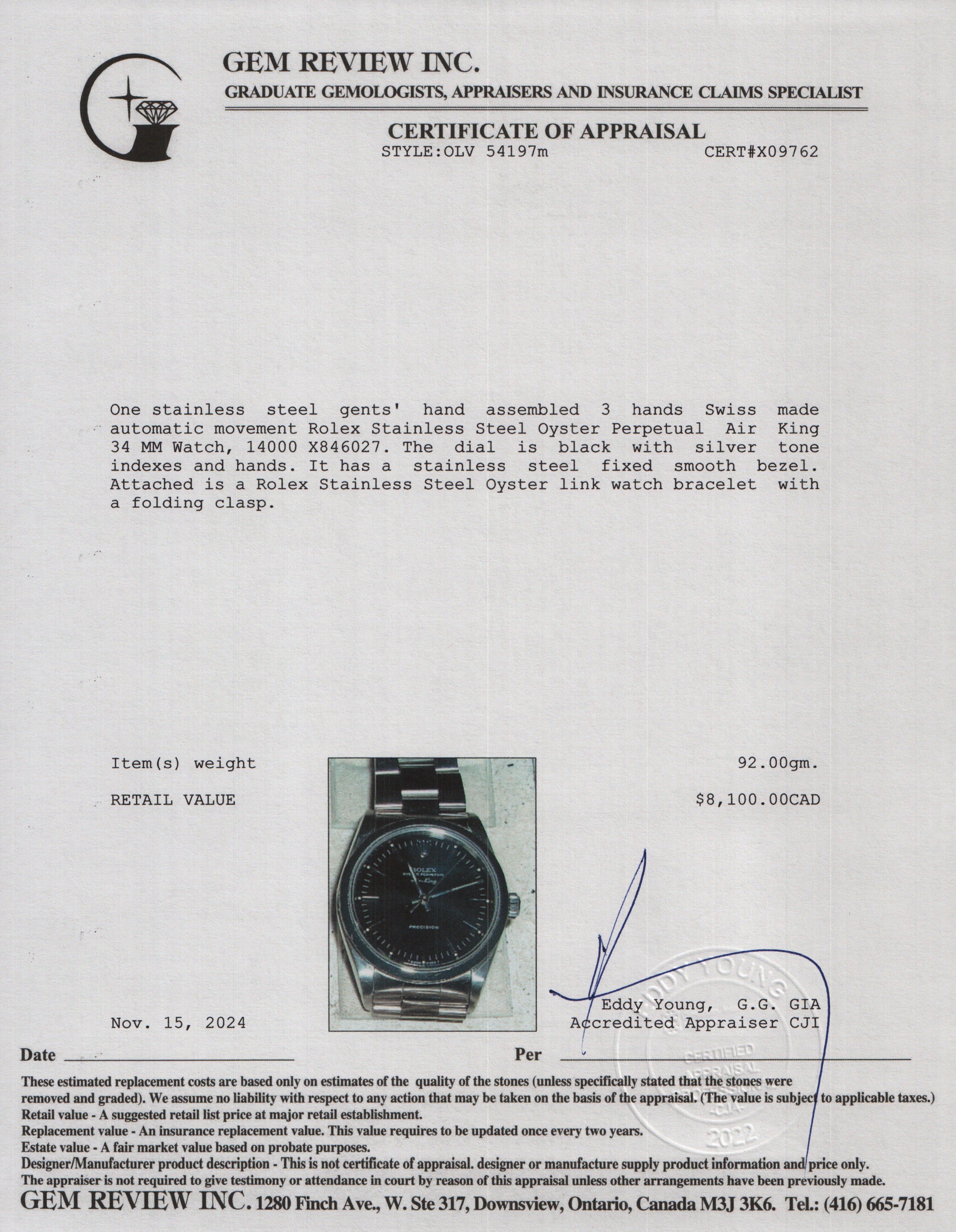 Stainless Steel Oyster Perpetual Air King 34 MM Watch Black Dial 14000