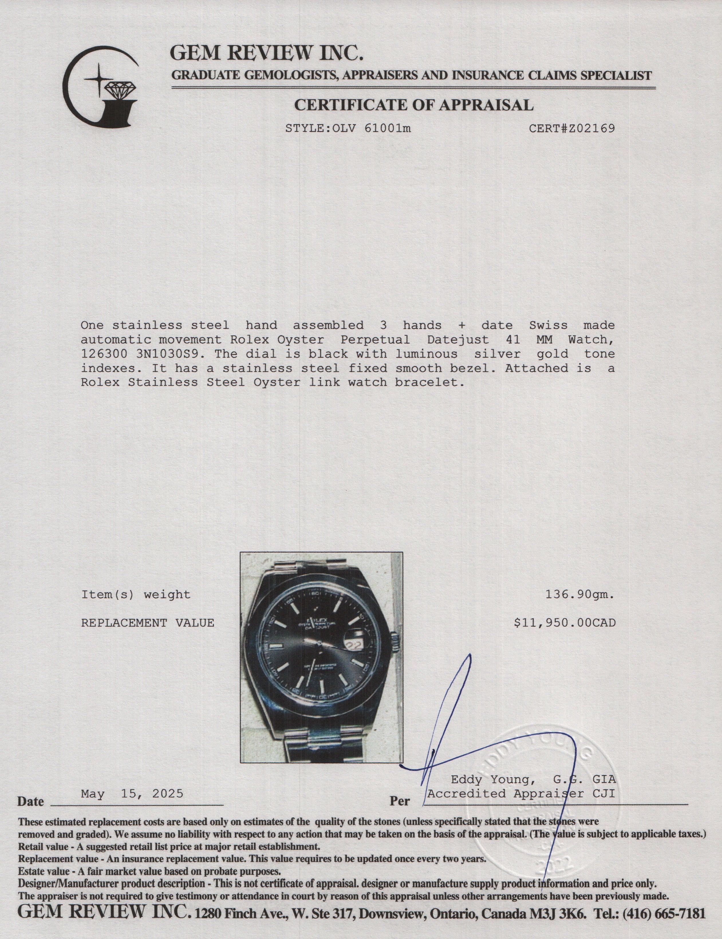 Stainless Steel Oyster Perpetual Black Dial Datejust 41 MM Watch 126300 w/ Box & Papers