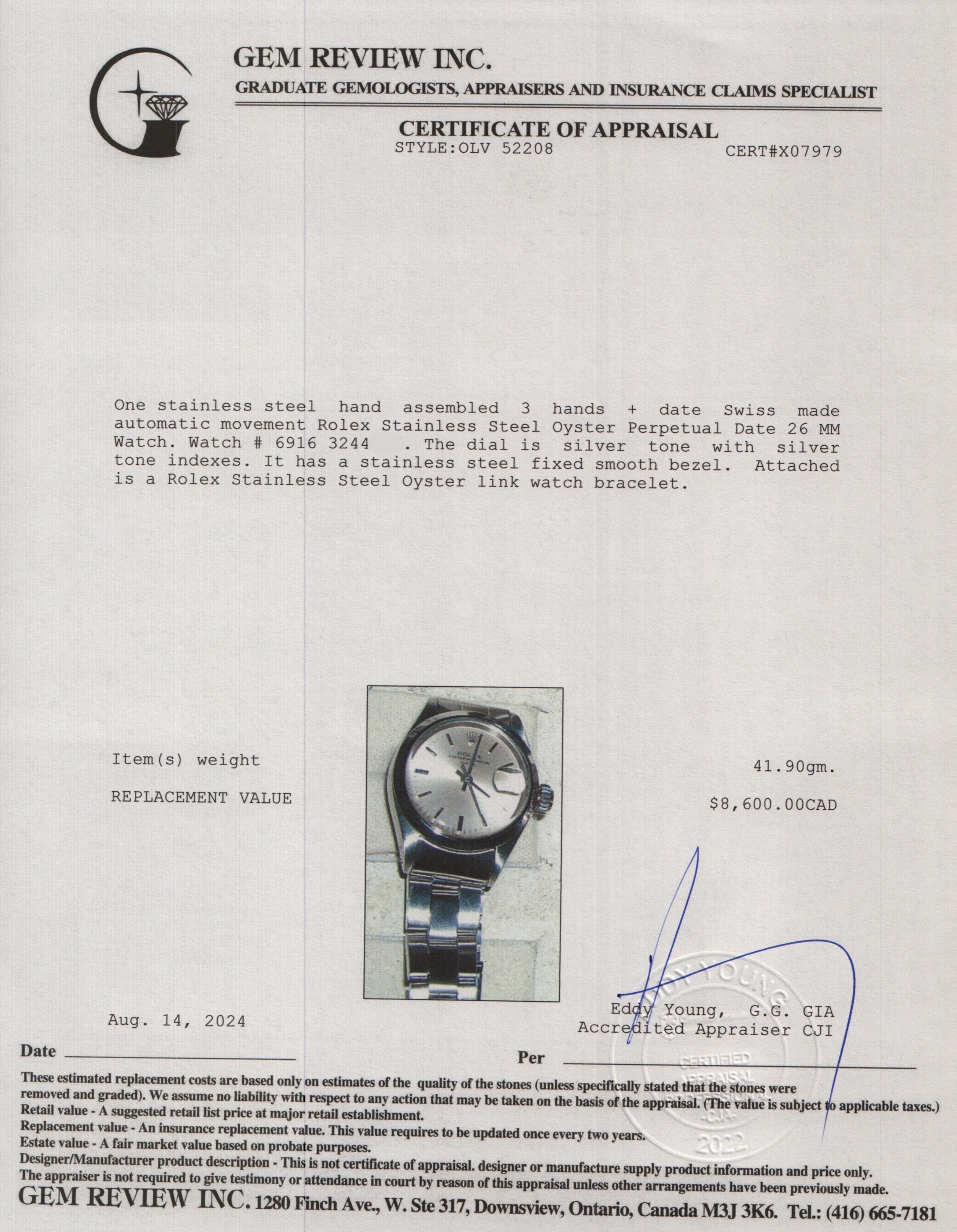 Stainless Steel Oyster Perpetual Date 26 MM Watch 6916