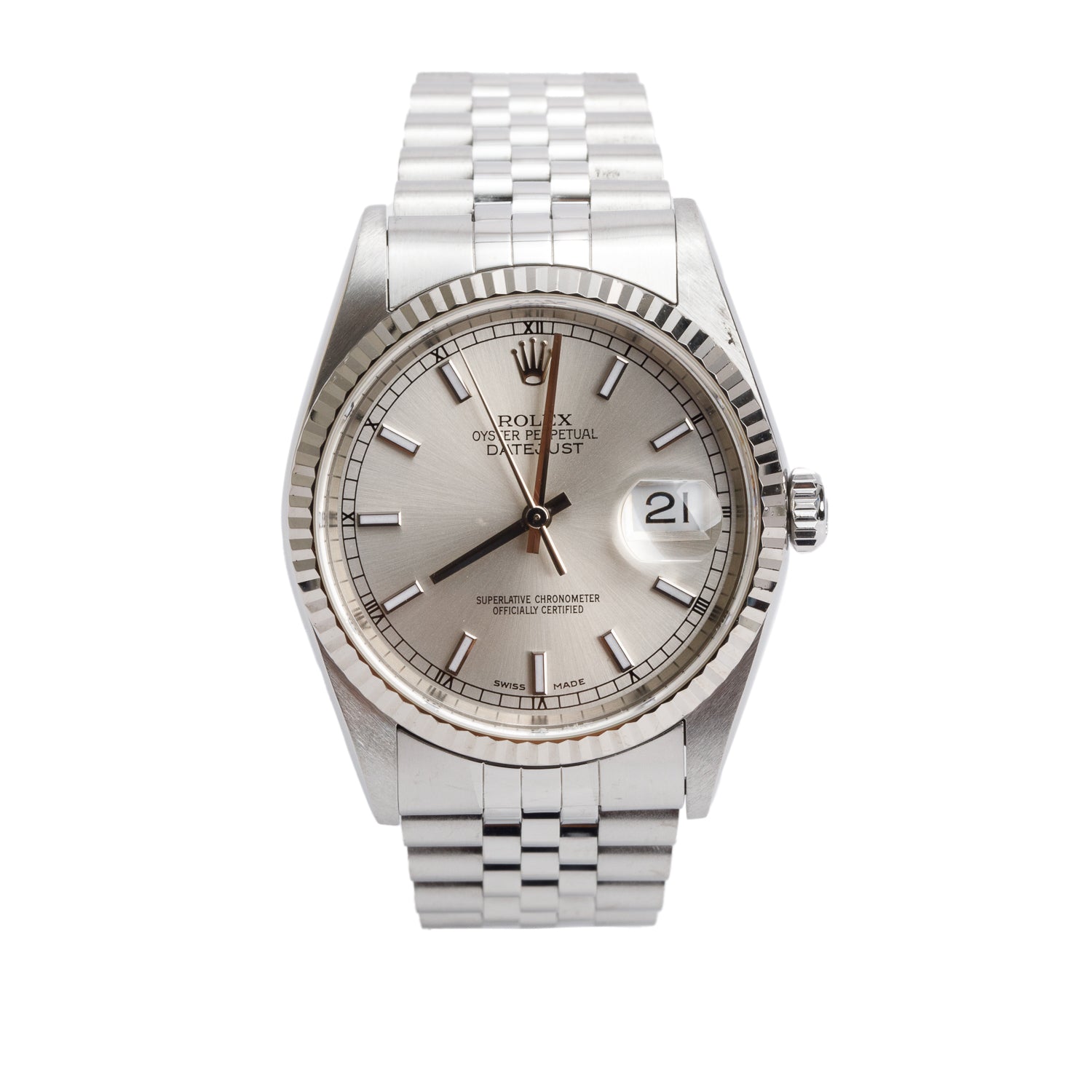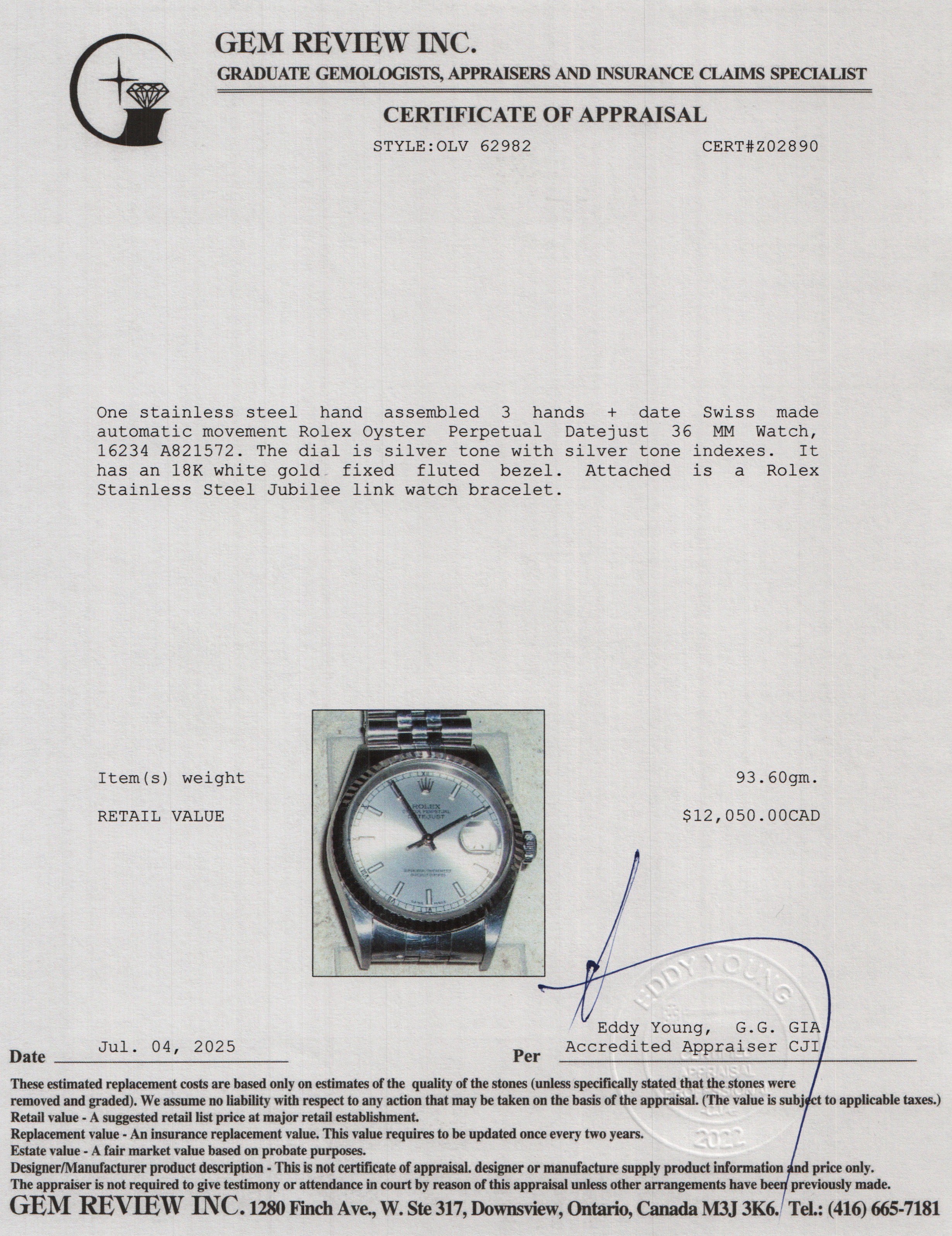 Stainless Steel Oyster Perpetual Datejust 36 MM Silver Dial Watch 16234 w/ Box