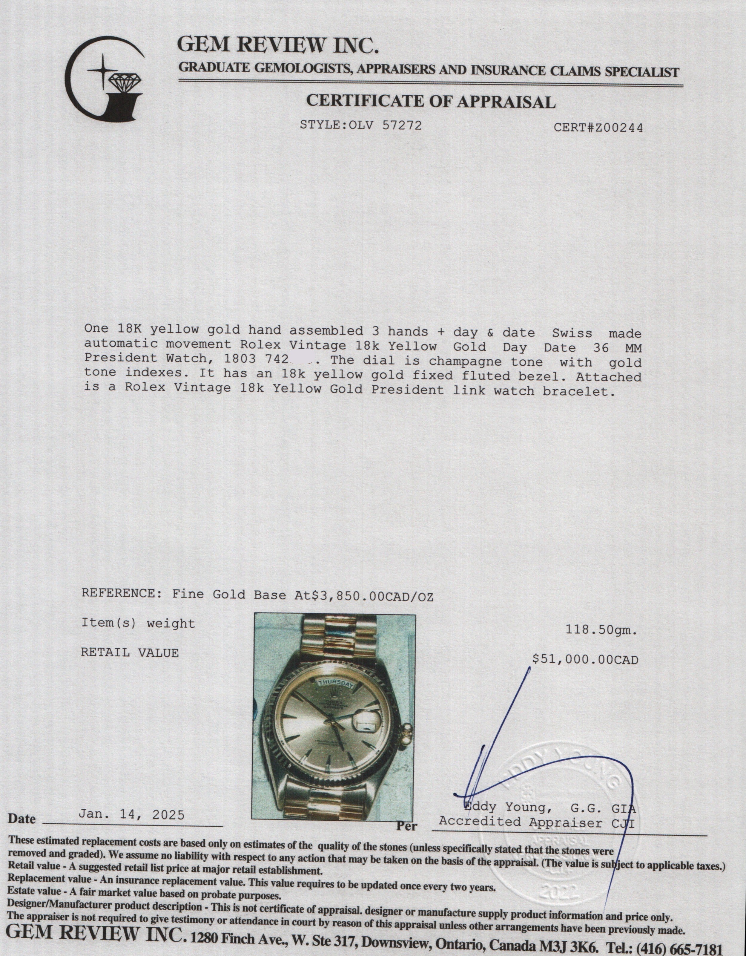 Vintage 18k Yellow Gold Day Date 36 MM President Watch 1803 w/ Box