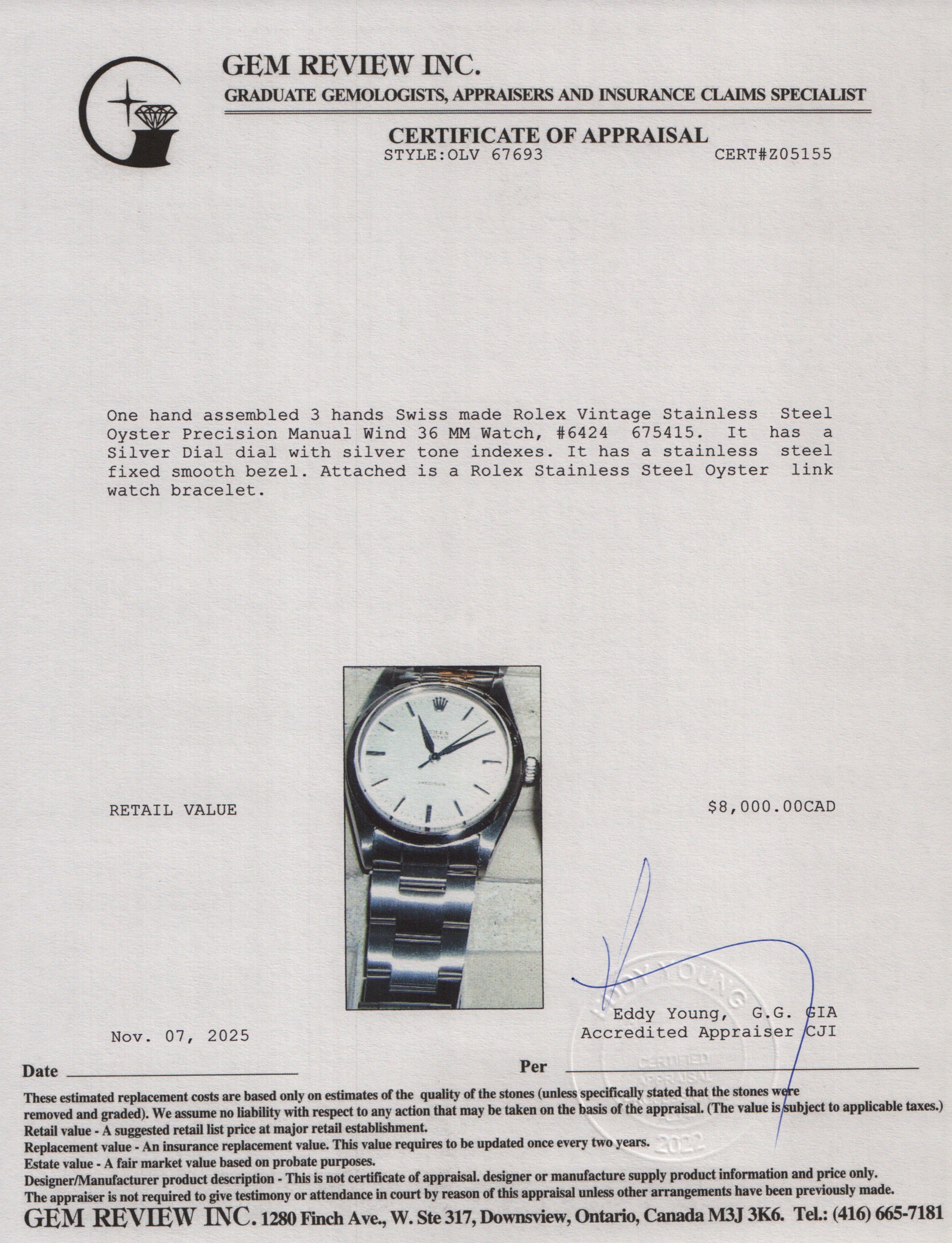 Vintage Stainless Steel Oyster Precision Manual 36 MM Watch Silver Dial 6424 w/ Box