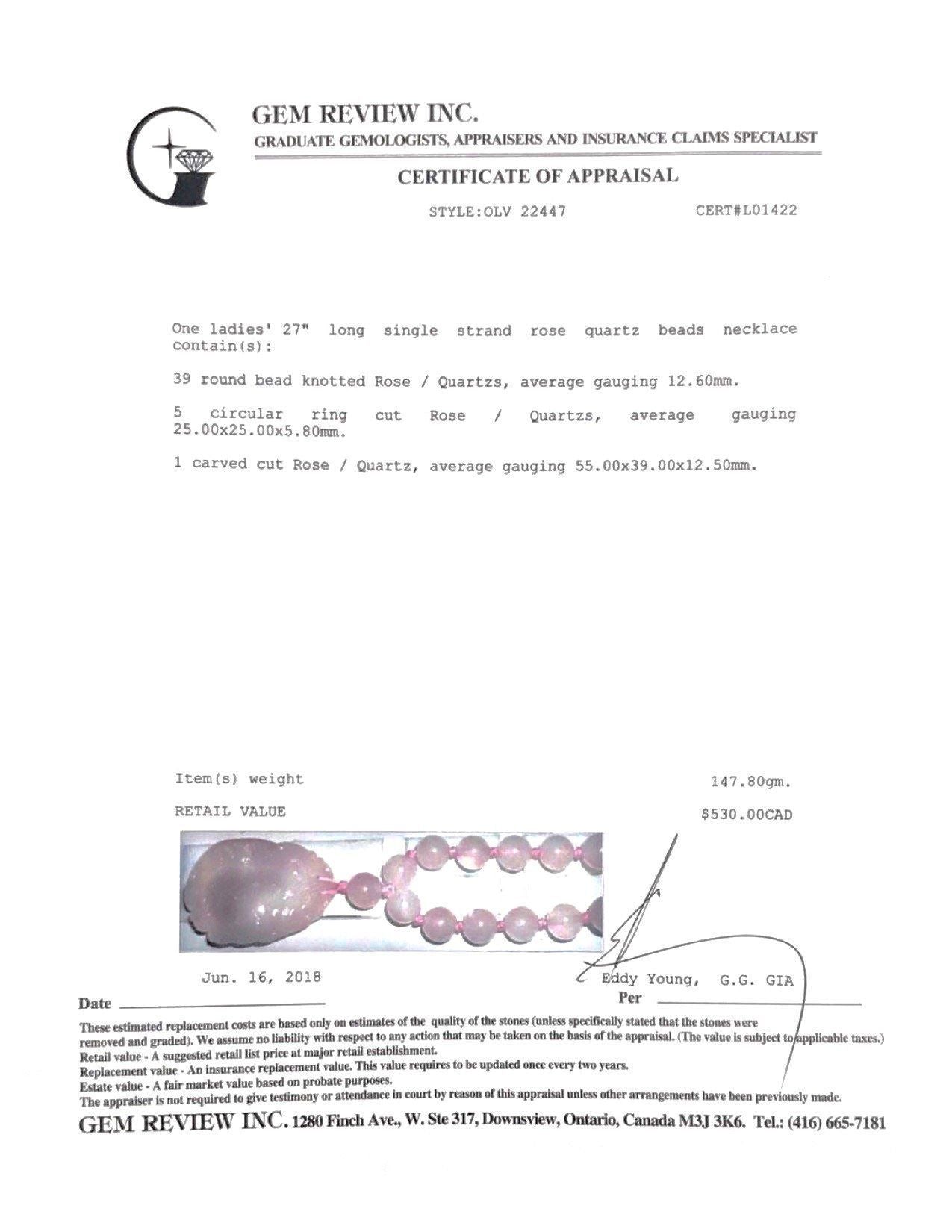 Rose Quartz Bead Necklace with Carved Rose Quartz Pendant