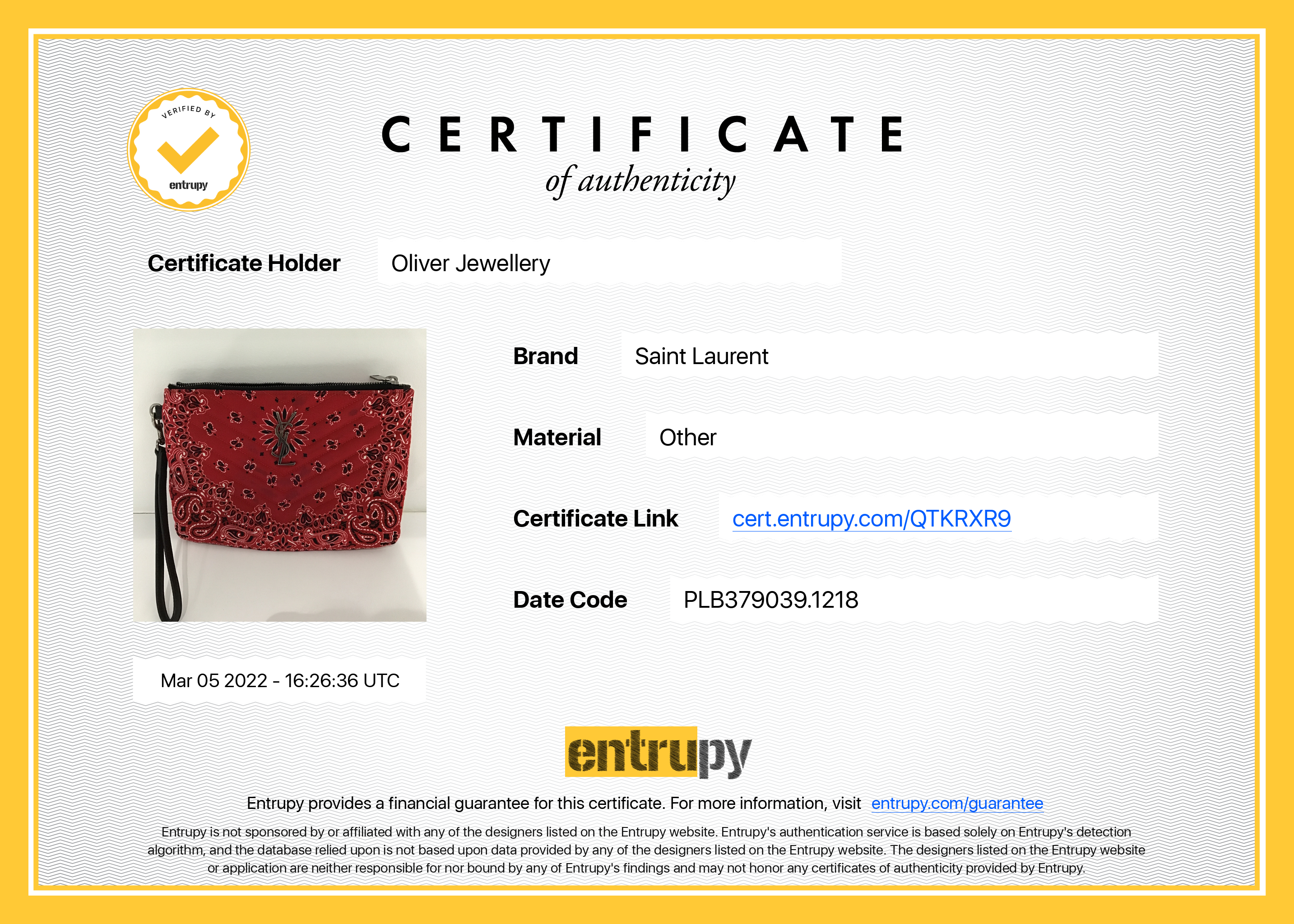 Included Items: Entrupy Certificate of Authenticity #: QTKRXR9