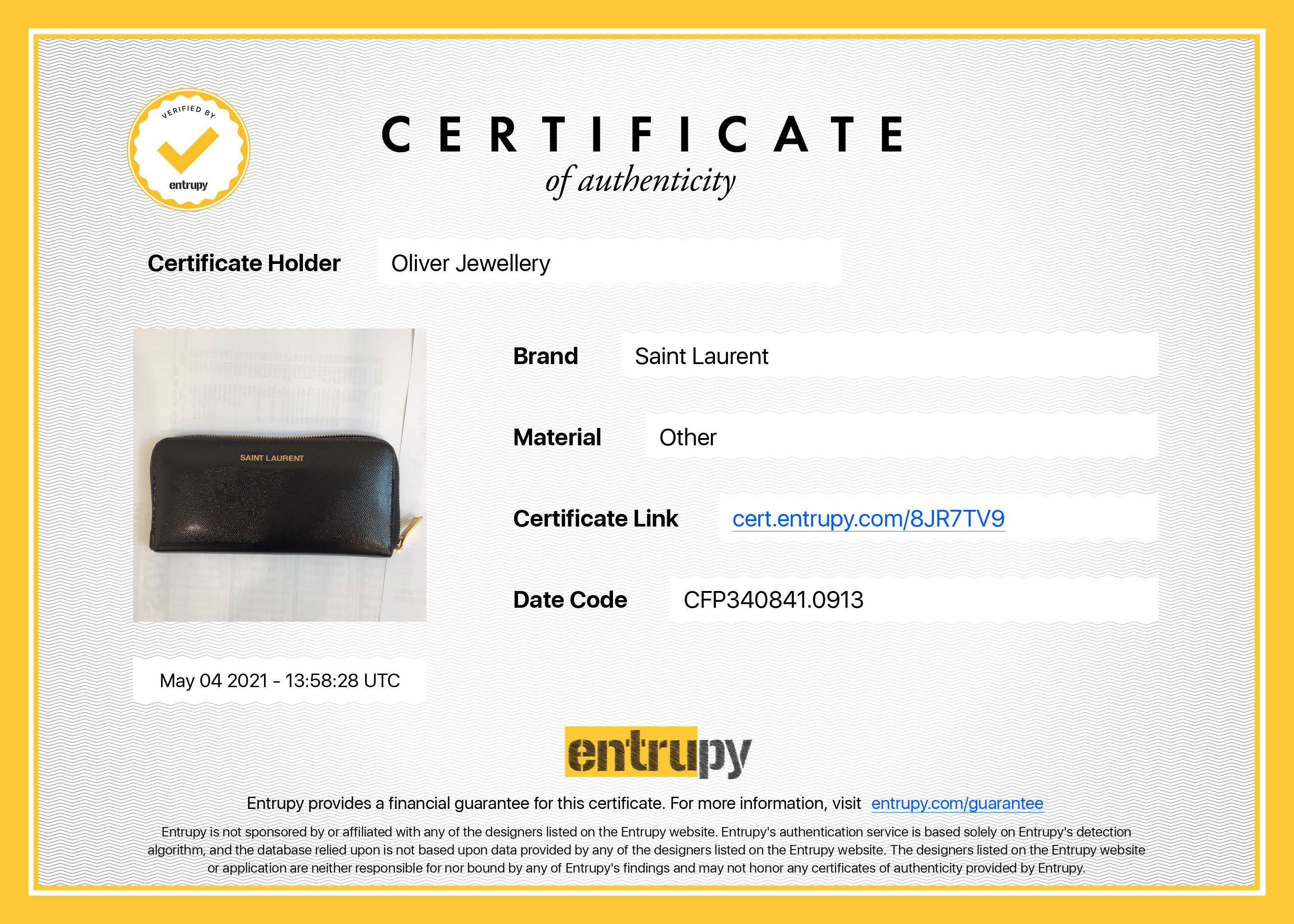 Included Items: Entrupy Certificate of Authenticity #: 8JR7TV9