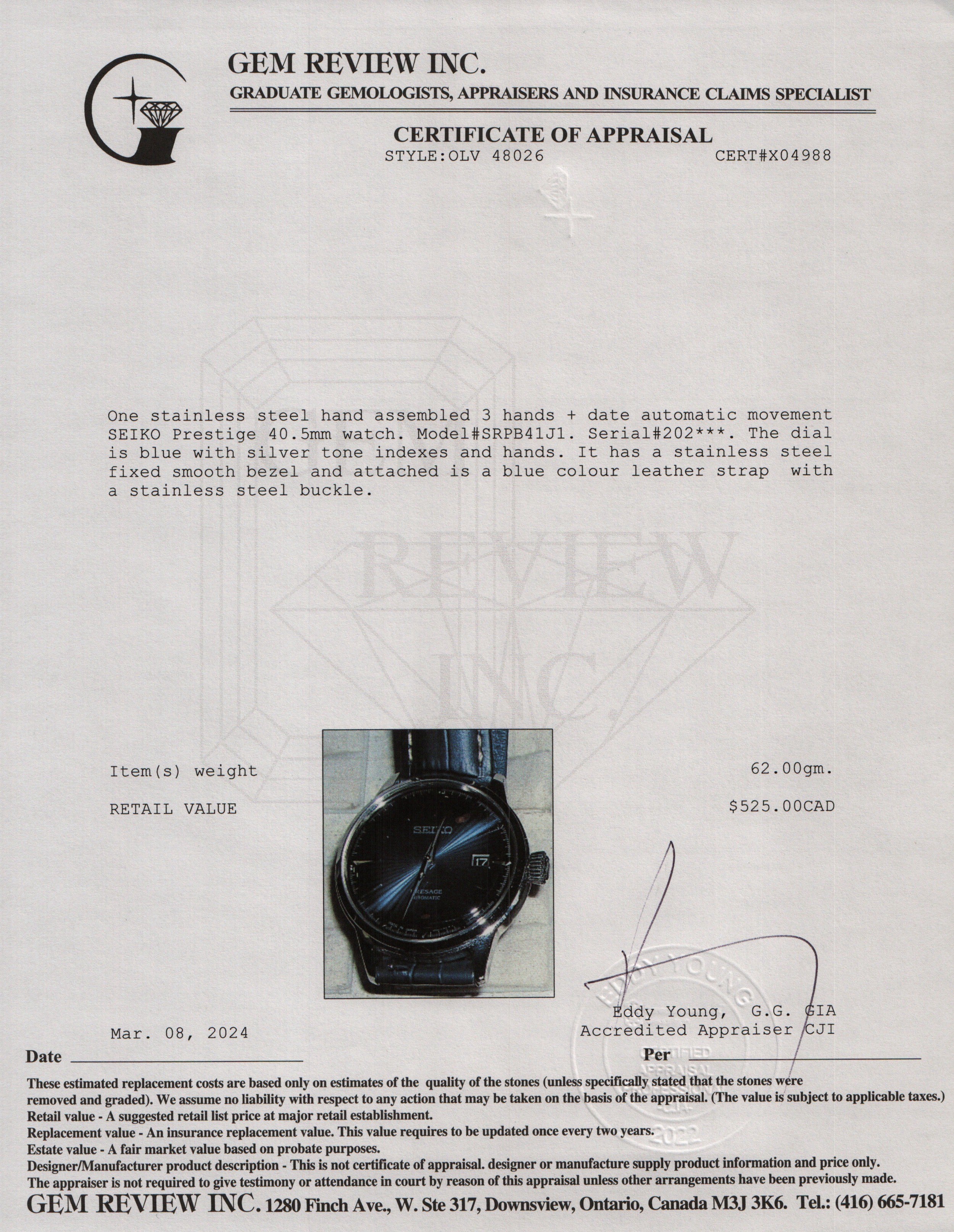 2023 Stainless Steel Presage 40.5 MM Automatic Watch w/ Box, Papers & Extra Strap