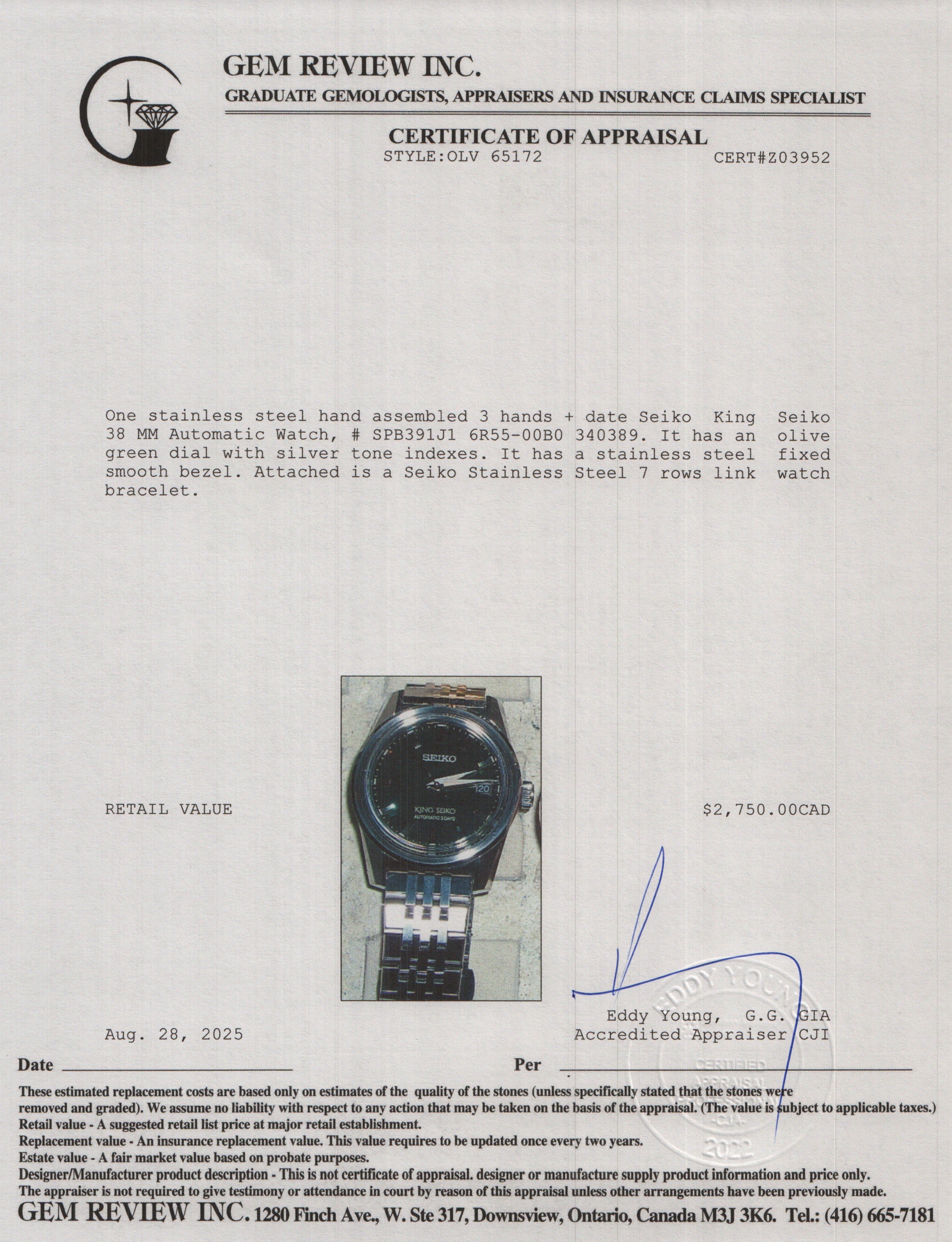 Stainless Steel King 38 MM Automatic Watch Olive Green Dial SPB391J1 w/ Box