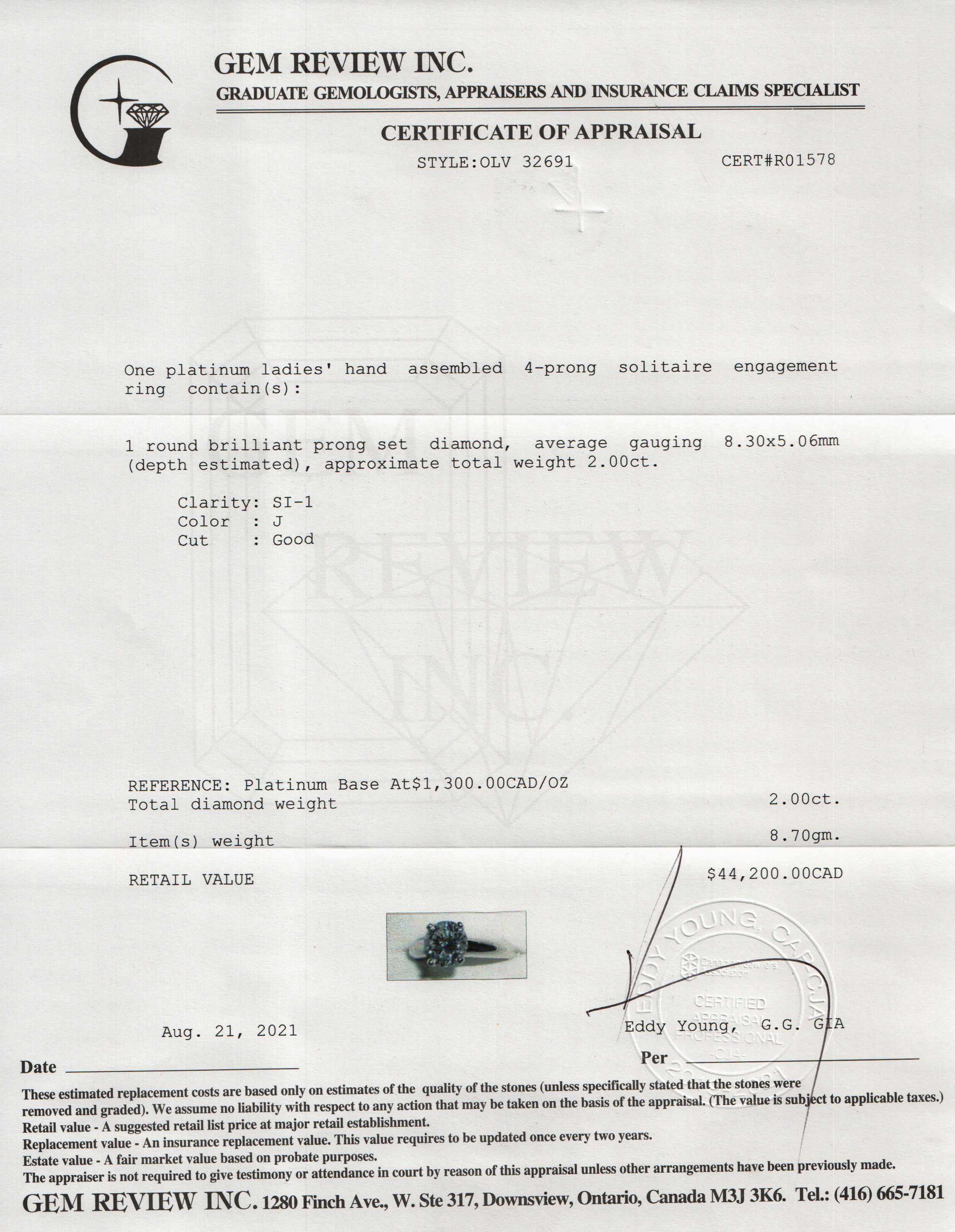 - 1 Round Brilliant Cut Diamond Weighing Approximately 2.00 ct. of SI1 Clarity, J Colour, Good Cut