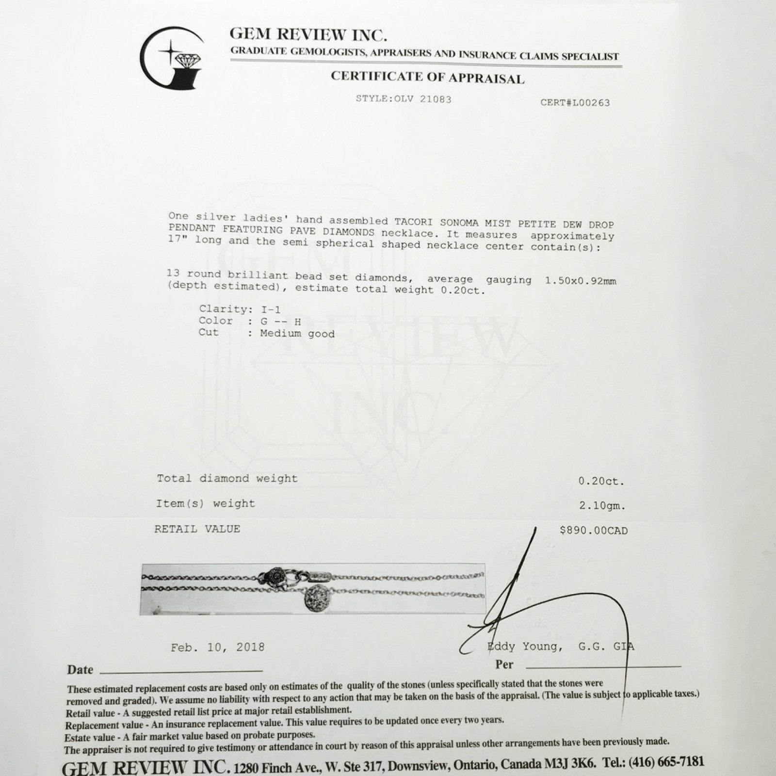 Tacori Sonoma Mist Petite Dew Drop Pendant in Sterling Silver Set with Pave Diamonds (0.20 TCW) on Sterling Silver necklace, Approximately 17” Long, Comes with Gem Review Appraisal