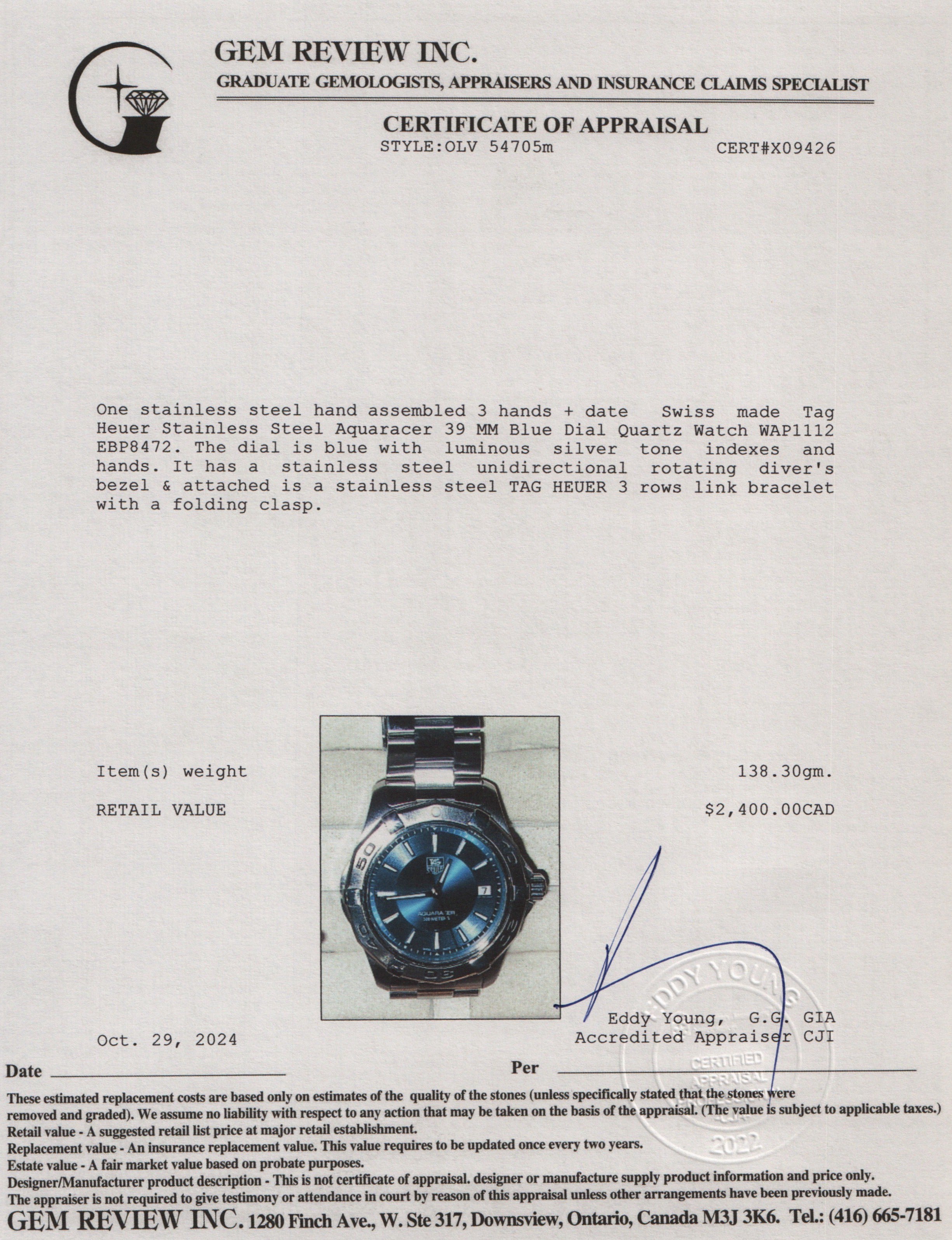 Stainless Steel Aquaracer 39 MM Blue Dial Quartz Watch WAP1112