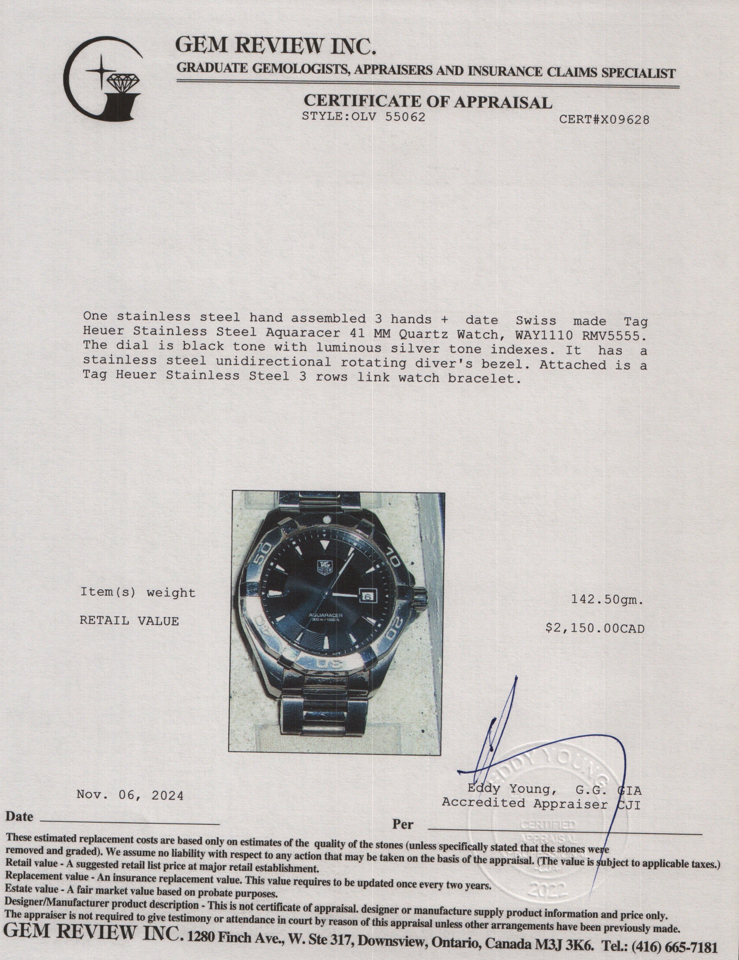 Stainless Steel Aquaracer 41 MM Quartz Watch WAY1110 w/ Box & Papers