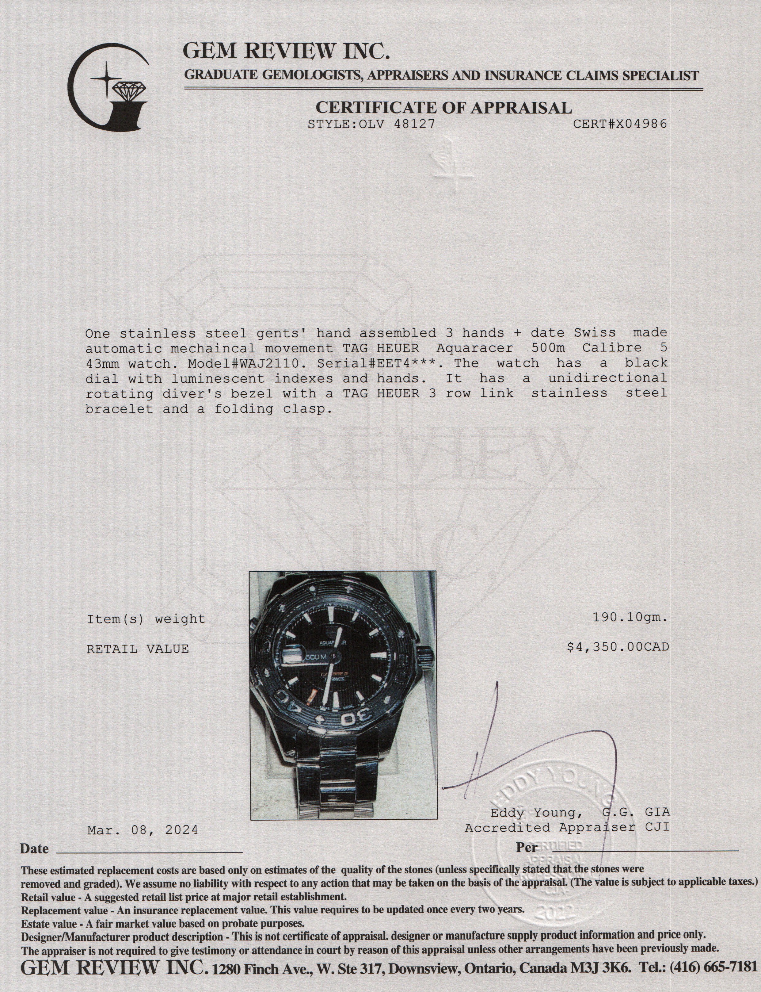 Stainless Steel Aquaracer 500M Calibre 5 43 MM Automatic Watch w/ Box & Papers